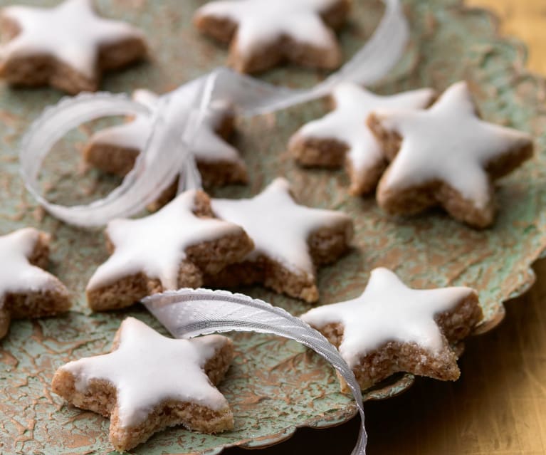 Montare a lungo, con la frusta elettrica, gli albumi a neve aggiungendo lo zucchero, la can- nella e qualche goccia di succo di limone. Dal composto ottenuto, togliere 4-5 cucchiai che verranno utilizzati per glassare i biscotti. Al resto unire le mandorle e un pizzico di sale. Cospargere la spianatoia con zucchero e farina in parti uguali. Dividere la pasta in 5-6 parti e stenderle, su questa mistura, a uno spessore di 5 mm. Ritagliare le stelle, metterle in una teglia foderata con carta forno e glassarle con il com- posto messo da parte; lasciare riposare i biscotti per 15 minuti, quindi cuocerli a 180° finché la glassa sulla punta delle stelle non comincia a colorarsi.