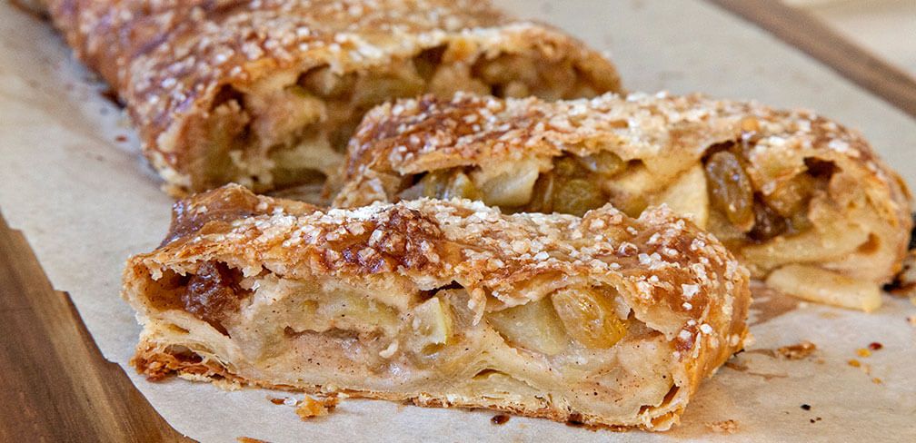 Preparate la pasta strudel. Lasciate riposare la pasta per 30 minuti, avvolta in un telo umido. Mettete l’uva sultanina in ammollo. Nel frattempo preparate la crema alle mandorle. In una terrina, mescolate i tuorli con lo zucchero, unite la farina, un pizzico di cannella in polvere, e versate a filo la panna bollente. Disponete il tutto sul fuoco e fate cuocere per 7-8 minuti, lasciate poi raffreddare, e solo dopo unite le mandorle tritate, l’uva sultanina strizzata, la frutta candita a dadini e amalgamate bene il tutto. Stendete la pasta sul telo infarinato e spennellate l’interno con il burro fuso. Disponete poi la crema ormai fredda, lasciando alle estremità 2 cm di pasta. Arrotolate lo strudel aiutandovi con il telo, sigillate con cura le estremità e spennellate la superficie con burro fuso. Trasferite lo strudel su una teglia imburrata e infarinata, poi infornate in forno già caldo a 180°C per 50 minuti. A cottura terminata lasciate intiepidire, spolverizzatelo con zucchero a velo e servite a fette.