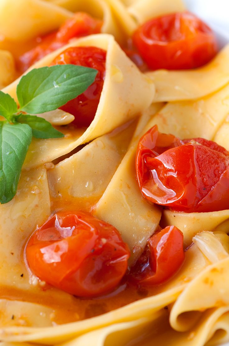 Scaldate il forno a 180°C. Tagliate a metà i pomodori nel senso della lunghezza dopo avere eliminato il picciolo e disponeteli in una teglia con il lato tagliato rivolto verso l’alto. Spruzzate 1 cucchiaio d’acqua sui pomodori per evitare che si attacchino alla teglia, aggiungete l’aglio e spennellate pomodori e aglio con olio evo. Cospargete i pomodori con il basilico, aggiungete sale e pepe e cuoceteli in forno per 25 minuti o finché saranno morbidi. Toglieteli delicatamente dalla teglia e metteteli da parte. Scaldate la teglia sulla fiamma bassa, versateci il brodo, il vino bianco e l’aceto e portateli a ebollizione. Abbassate la fiamma e lasciate sobbollire piano piano per 20 minuti. Sminuzzate i pomodori raccogliendo tutto il succo in una terrina. Schiacciate gli spicchi d’aglio per spellarli e metteteli nella teglia insieme ai pomodori sminuzzati e al loro stesso succo. Assaggiate la salsa e aggiungete se necessario un po di sale e pepe. Cuocete al dente le tagliatelle in abbondante acqua salata, scolatele bene e versatele in una terrina da portata. Condite la pasta con la salsa e il formaggio grattugiato e servite subito a tavola.