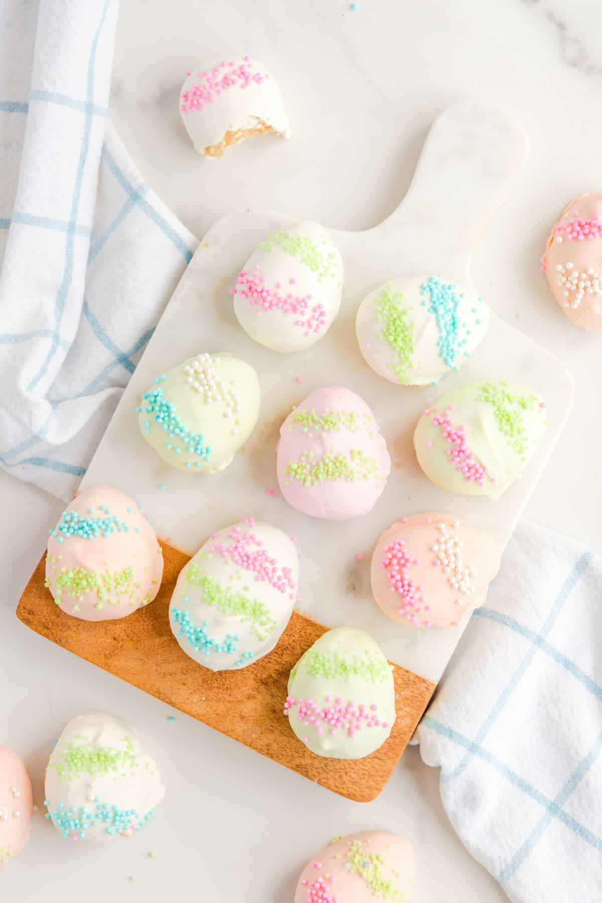 Se le tue palline di oreo pasquali si stanno sgretolando, potresti aver usato troppi oreo o troppo poco formaggio cremoso. Puoi regolare aggiungendo un po ‘più di crema di formaggio alla miscela.