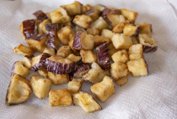 Le melanzane, cuore pulsante di questo piatto, vengono preparate con cura. Dopo essere state tagliate e lasciate riposare per rilasciare l’acqua in eccesso, vengono fritte fino a diventare dorate e croccanti, aggiungendo un tocco irresistibile di consistenza.
