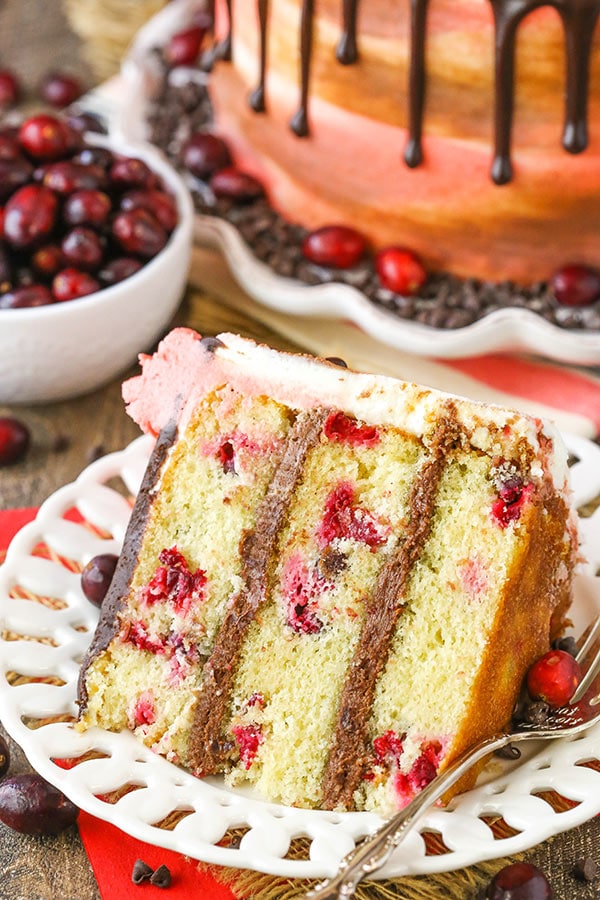 Questa torta a strati con glassa al cioccolato fondente e mirtilli rossi è fatta con una torta umida alla vaniglia tempestata di mirtilli rossi freschi e farcita con glassa al cioccolato! È una umida e deliziosa e ottima per le vacanze!