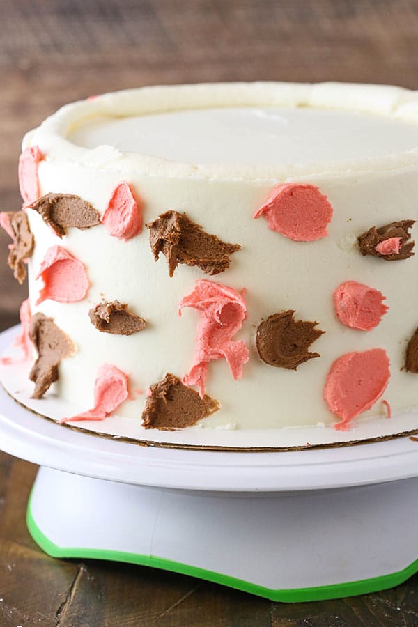 Gli strati di torta sono stratificati con glassa di cioccolato tra di loro, poi l’esterno viene glassato con la glassa di vaniglia in entrambi i colori bianco e rosso, e la glassa di cioccolato rimanente. Per creare lo stesso look che ho io, glasserai l’esterno della torta con la glassa alla vaniglia bianca, quindi aggiungerai piccoli puntini di glassa rossa e cioccolato intorno ad essa. Se conosci il mio tutorial sulla glassa liscia, dovresti iniziare a rendere le cose più lisce sui lati con la glassa più liscia, aggiungere i punti di colore, quindi finire di lisciare i lati, creando questo divertente effetto. Finisci la torta con gocce di ganache al cioccolato e un bordo profilato e hai proprio lo storditore tra le mani!