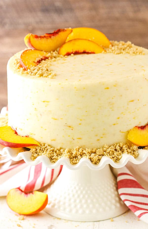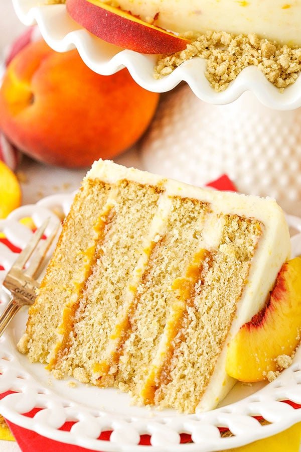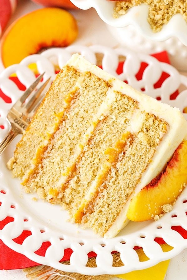 Questo è sicuramente un buon periodo dell’anno per innamorarsi anche delle pesche. Le pesche della Georgia sono state totalmente incredibili e i ragazzi sono stati viziati dalla loro freschezza e sapore. Mi sembra di dover comprare un camion e congelarli in modo da averli tutto l’inverno. Se solo i ragazzi fossero stati abbastanza grandi da provare la torta, so che avrebbero amato questa torta tanto quanto noi.