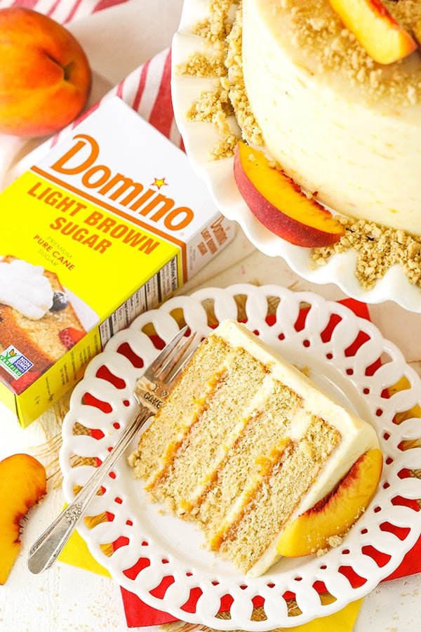 Questa torta a strati con zucchero di canna e ripieno alla pesca è stata un successo! Il compleanno di mio padre è stata la settimana in cui ho fatto questa torta e come ho detto, è un grande fan delle pesche. È stata la torta perfetta per lui e tutta la famiglia ha adorato la torta! Le pesche sono deliziose e la torta è meravigliosamente umida e saporita, perfettamente accompagnata dalla leggera glassa al mascarpone. Posso vedere questa torta che faremo per più compleanni e spero che tu abbia la possibilità di provarla anche tu!