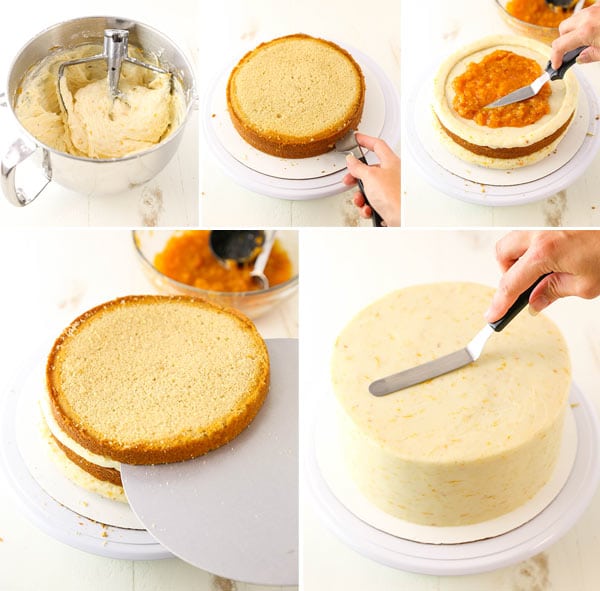 Quando le torte si saranno raffreddate, preparare la glassa. Questa glassa è così buona! È fatto con un po’ di burro e mascarpone, zucchero a velo e un po’ di ripieno di pesche. Il sapore del mascarpone arriva davvero ed è un complimento così leggero e piacevole per la torta di pesche e zucchero di canna.