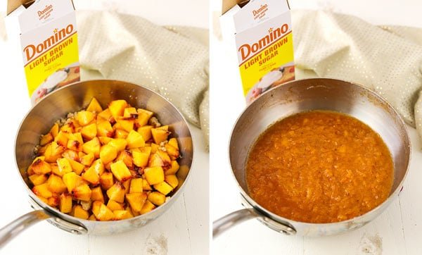 Gli ingredienti per il ripieno di pesche vengono combinati in una grande padella e riscaldati fino a quando non inizia a bollire. Ti consigliamo di schiacciare le pesche a quel punto, quindi lasciare che il composto continui a cuocere a fuoco lento fino a quando non si riduce di circa la metà. Continuerà ad addensarsi un po’ mentre si raffredda, ma nel complesso non è un ripieno super spesso.