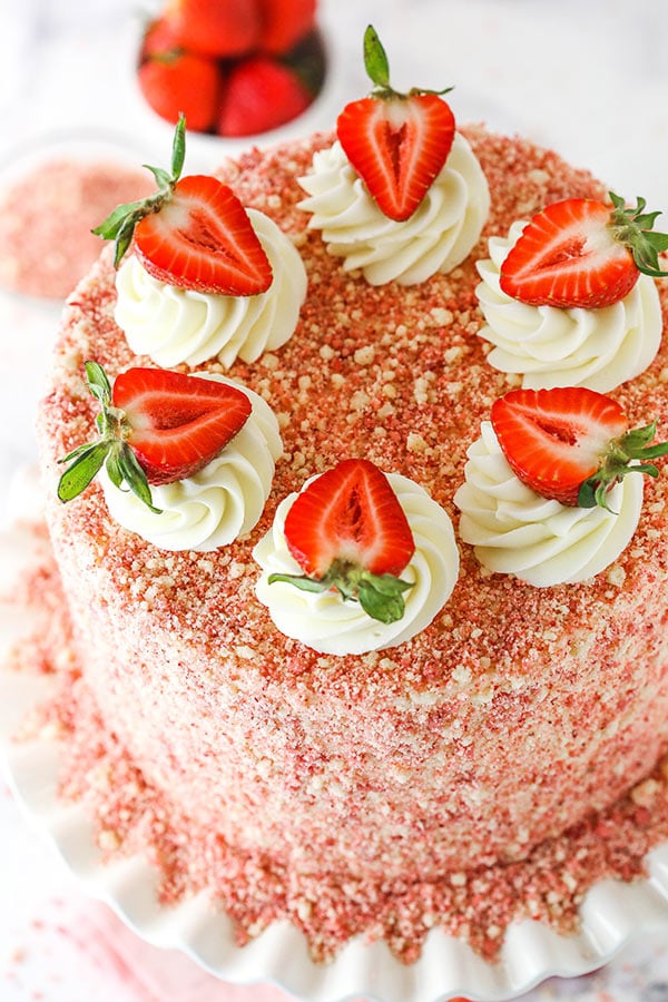 Avrai bisogno di circa 907 g di fragole fresche per questa torta. Avevo bisogno di un sacchetto da 28 g di fragole liofilizzate per il croccante.