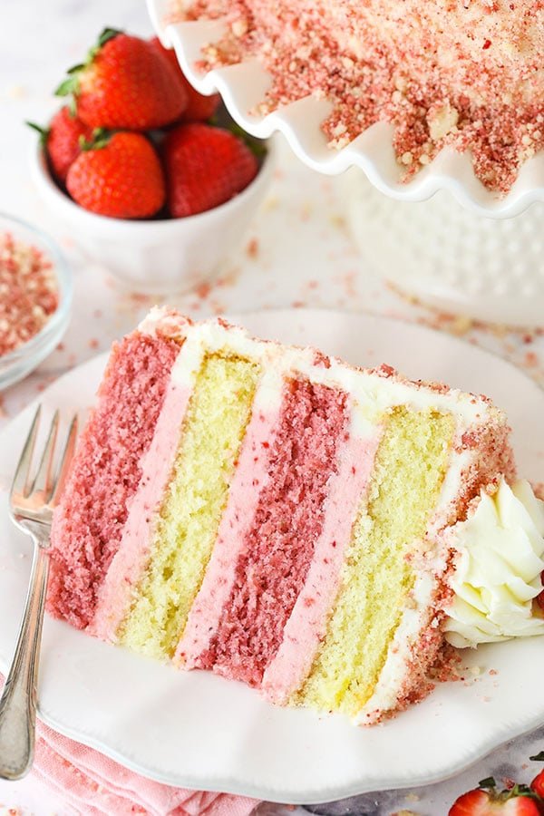 E per renderla ancora migliore, entrambi i tipi di torta provengono dallo stesso impasto per dolci! Non c’è bisogno di fare due impasti per torte separate Fate un’impasto, dividetelo alla fine e poi aggiungete gli ultimi ingredienti a ogni gusto. Entrambi i gusti di torta risultano meravigliosi e hanno un sapore straordinario. Non potrei amare di più questa torta a strati croccante alla fragola!
