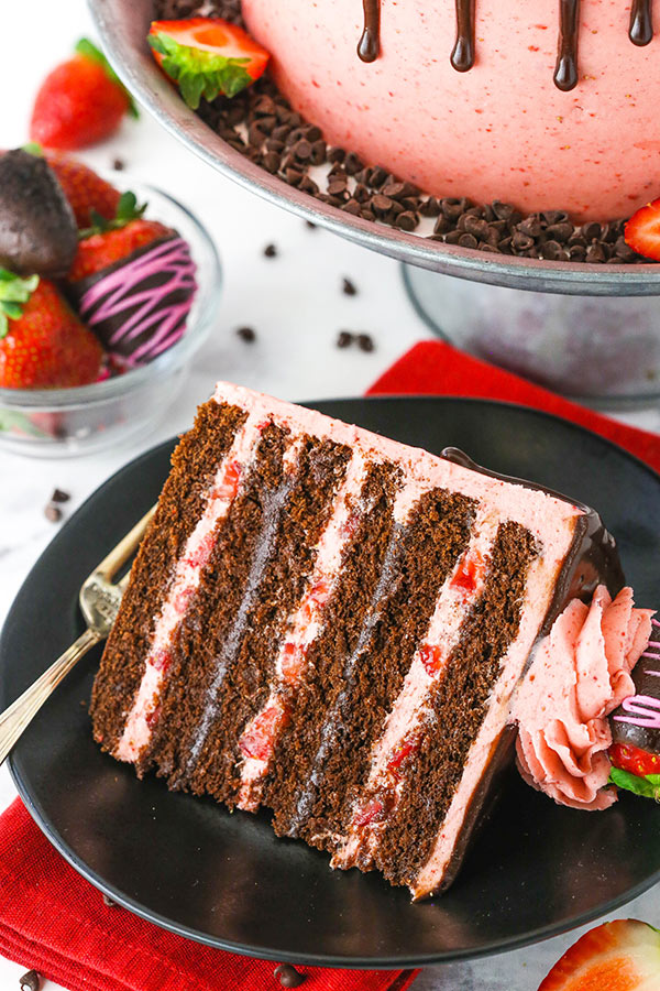 Questa torta inizia con morbidi strati di torta al cioccolato umida. Gli strati di torta sono riempiti con tre strati di fragole tritate e crema di burro di fragole e due strati di ganache di cioccolato. Tutti gli elementi delle fragole ricoperte di cioccolato in ogni boccone!