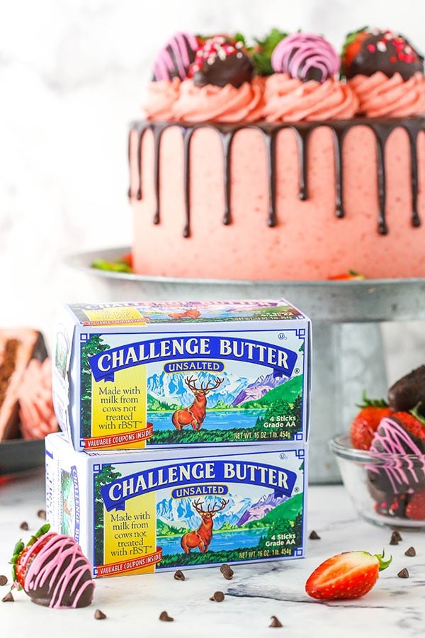 Questa torta a strati di fragole ricoperta di cioccolato è una torta al cioccolato umida a strati con fragole tritate fresche, crema al burro alla fragola e ganache al cioccolato! È ricoperta da una goccia di cioccolato e fragole ricoperte di cioccolato per una torta mozzafiato e deliziosa!