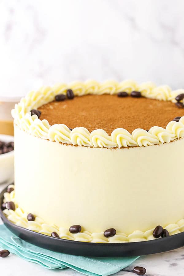La torta a strati tiramisù finale è meravigliosa! La torta e il ripieno sono belli e leggeri, il caffè e Kahlua sono deliziosi e la glassa al mascarpone unisce tutto! È la torta perfetta per l’amante del tiramisù nella tua vita!