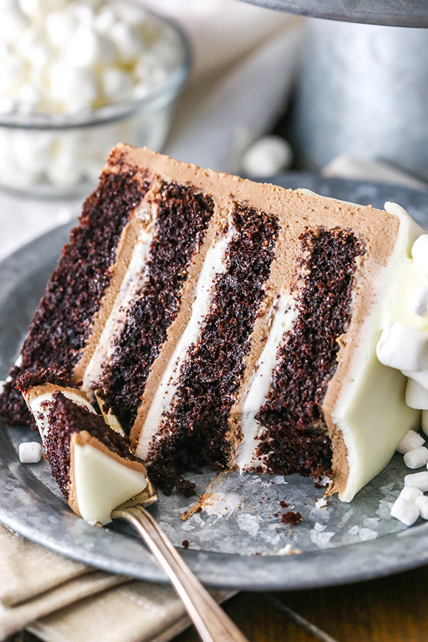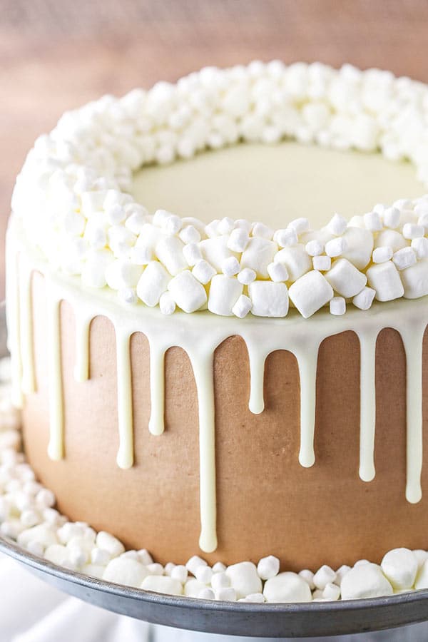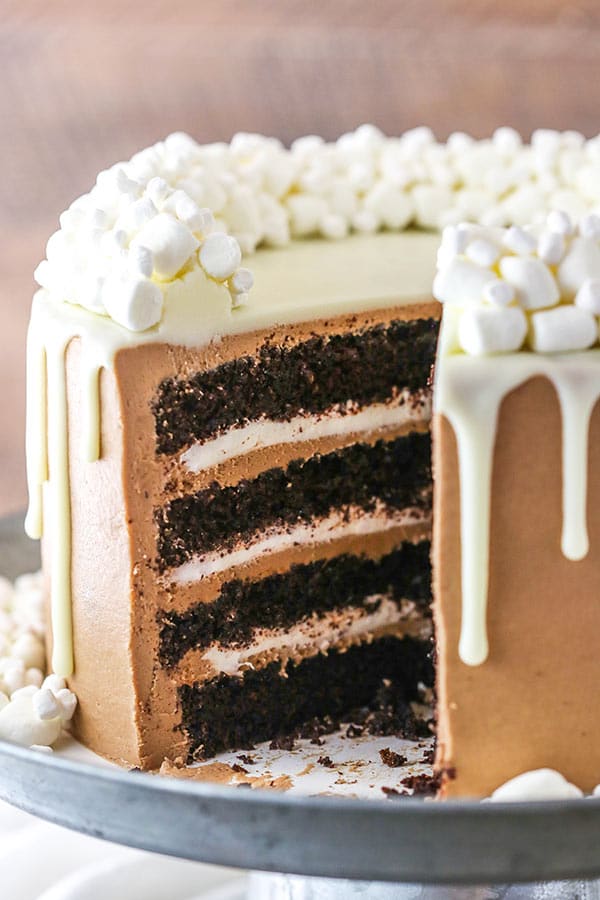 Il risultato finale di questa torta al cioccolato caldo è un dessert incredibile! La combinazione di torta al cioccolato umida, glassa alla cioccolata calda liscia e soffice ripieno di marshmallow è da morire. Mia madre ci è quasi morta sopra quando l’ha assaggiata e ho cercato di darla via il più velocemente possibile in modo da non accumularla tutta per me. Una torta buonissima e divertente!