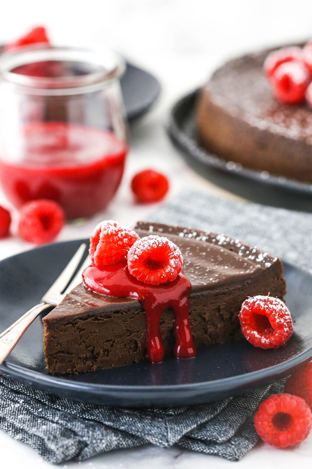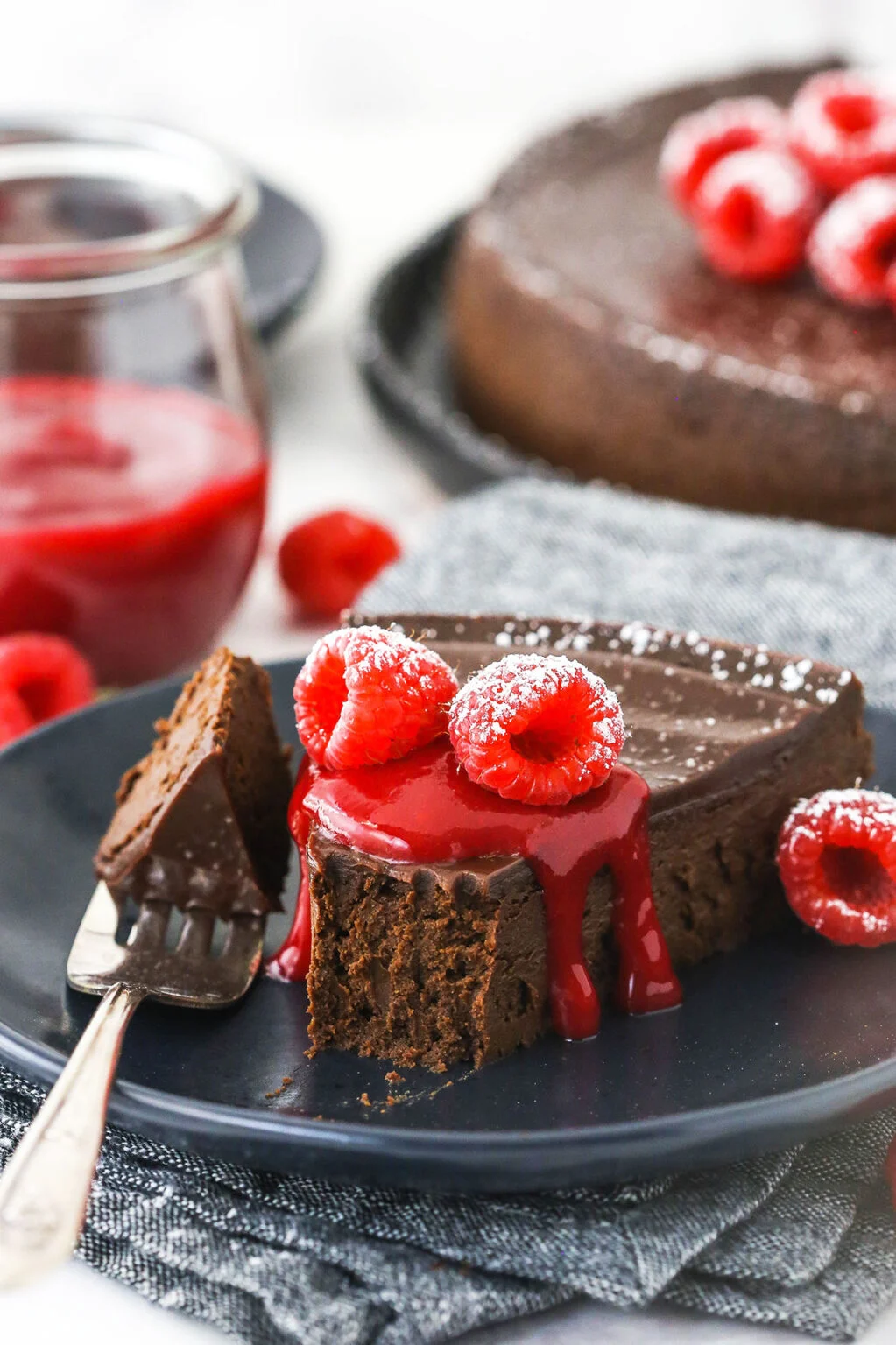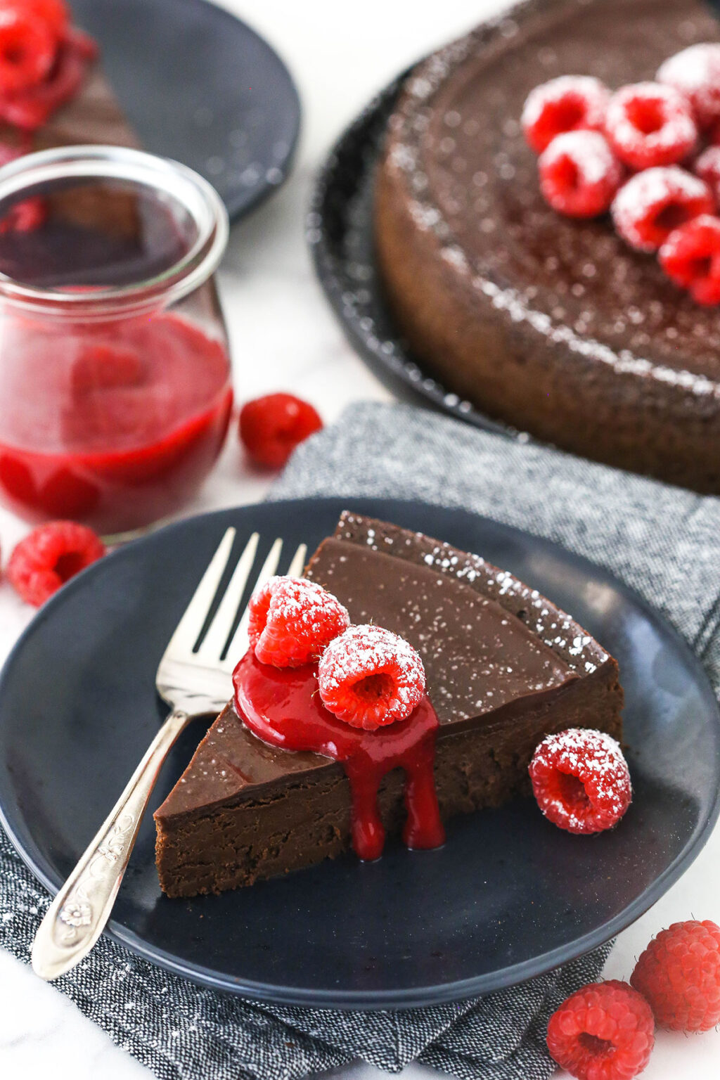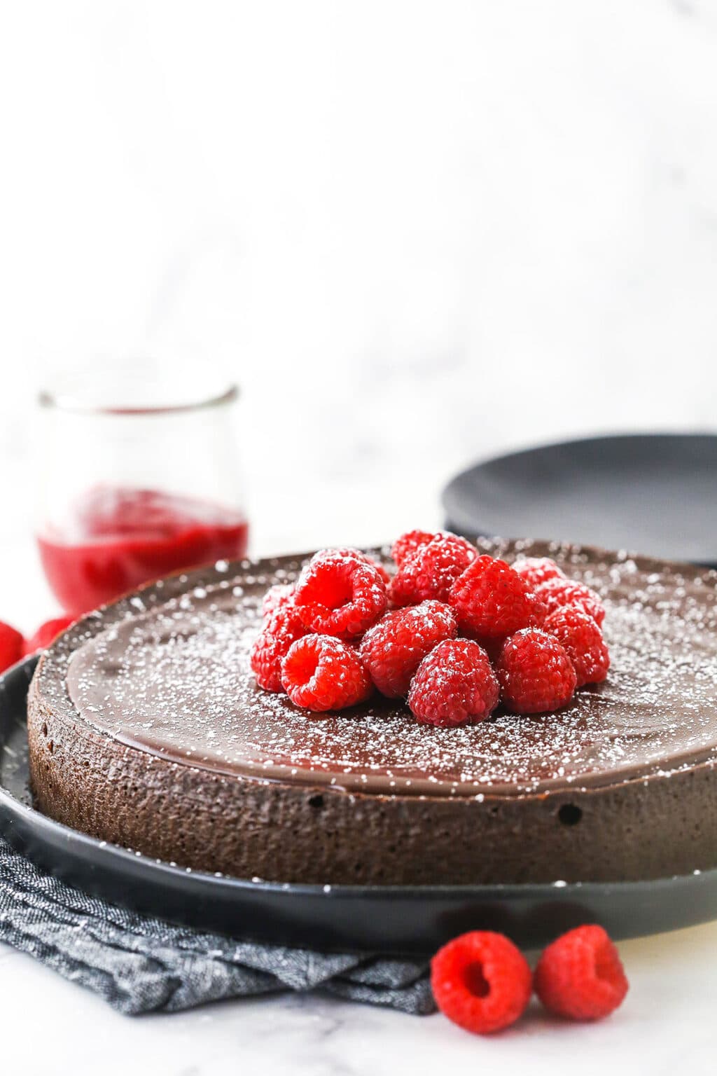 Anche se la salsa di lamponi è facoltativa, consiglio vivamente di montarla: non faccio mai questa torta senza di essa. Completa perfettamente la ricchezza del cioccolato. Poiché questa torta è così densa e ricca, è meglio servirla a fette più piccole. Ma con la salsa di lamponi in cima per bilanciare il ricco cioccolato, potrei praticamente mangiare tutto in una sola volta!