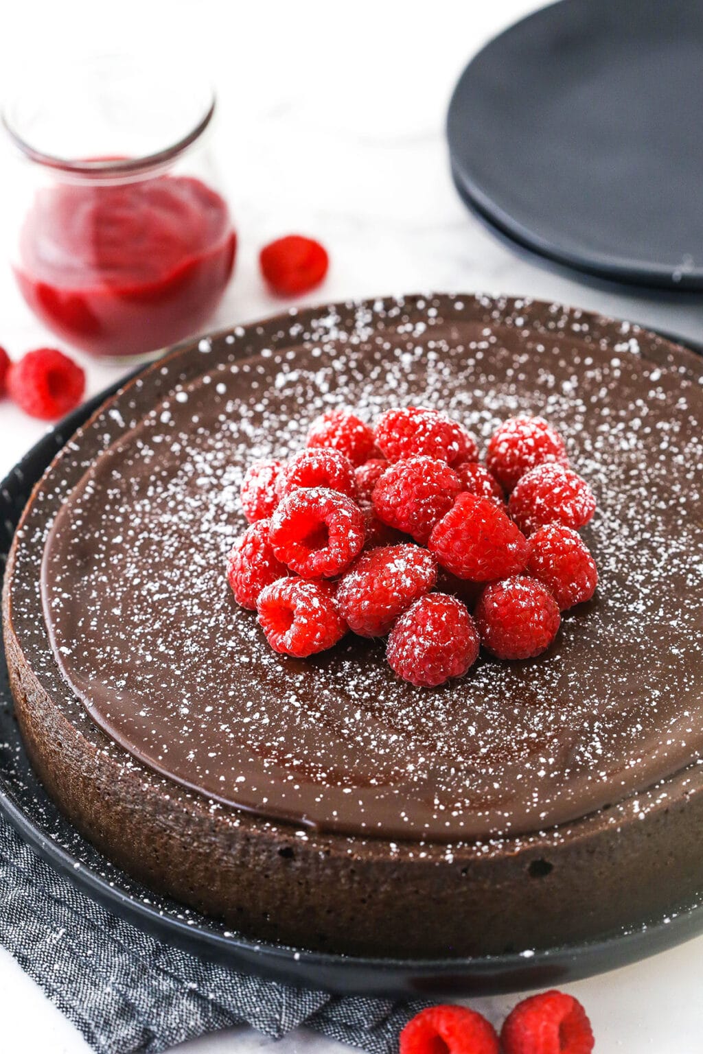 È abbinato a una ganache altrettanto cioccolatosa che vorrai mettere su tutte le torte che prepari in futuro. Mi piace completare il tutto con una spolverata di zucchero a velo, alcuni lamponi freschi e, naturalmente, salsa di lamponi fatta in casa. Potrei mangiare questa torta per dessert ogni singola sera e non annoiarmene mai.