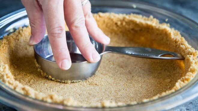 - In una ciotola media, unire le briciole di cracker Graham, il burro e lo zucchero. Versare in una tortiera da 9 pollici (22,86 cm).