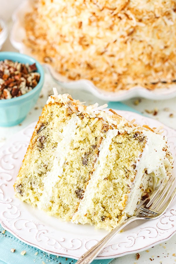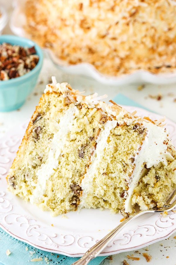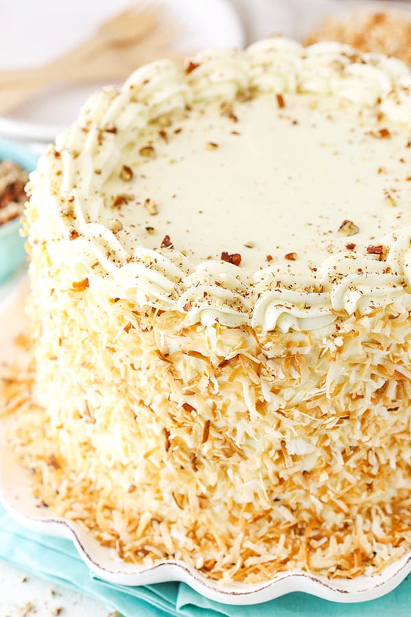 Ne ho trovati alcuni nella mia panetteria preferita nella nostra zona a nord di Atlanta. La torta aveva un sapore meraviglioso, il cocco e le noci pecan completavano tutto splendidamente e la glassa di crema di formaggio montata era così leggera che non riuscivo a smettere di mangiarla! Che torta gustosa!