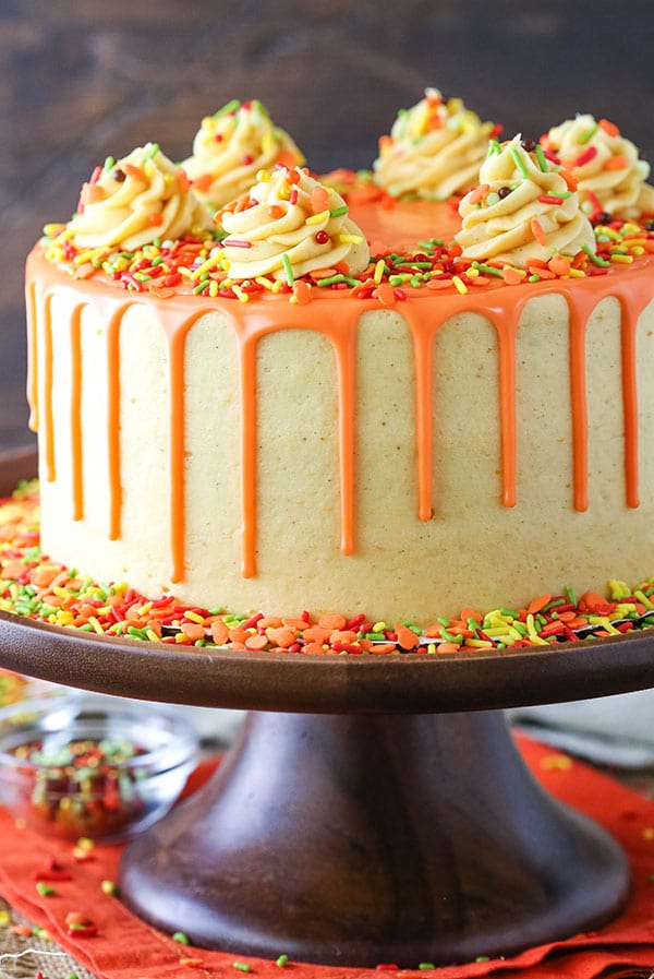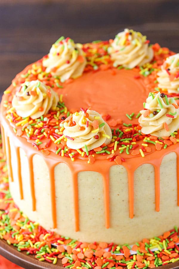 Dopo che la torta è glassata, è il momento delle decorazioni! Sicuramente sai che adoro una buona torta a goccia. Quando aggiungi una goccia colorata come questa, Candy Melts è la strada da percorrere. Ho usato i loro fusi all’arancia per questa torta, ma in passato li ho usati anche su altre torte divertenti, come questa torta a strati con chips di menta piperita e torta a strati con banana split. Sono una grande cosa da avere a portata di mano – tanti grandi colori e facile da usare.