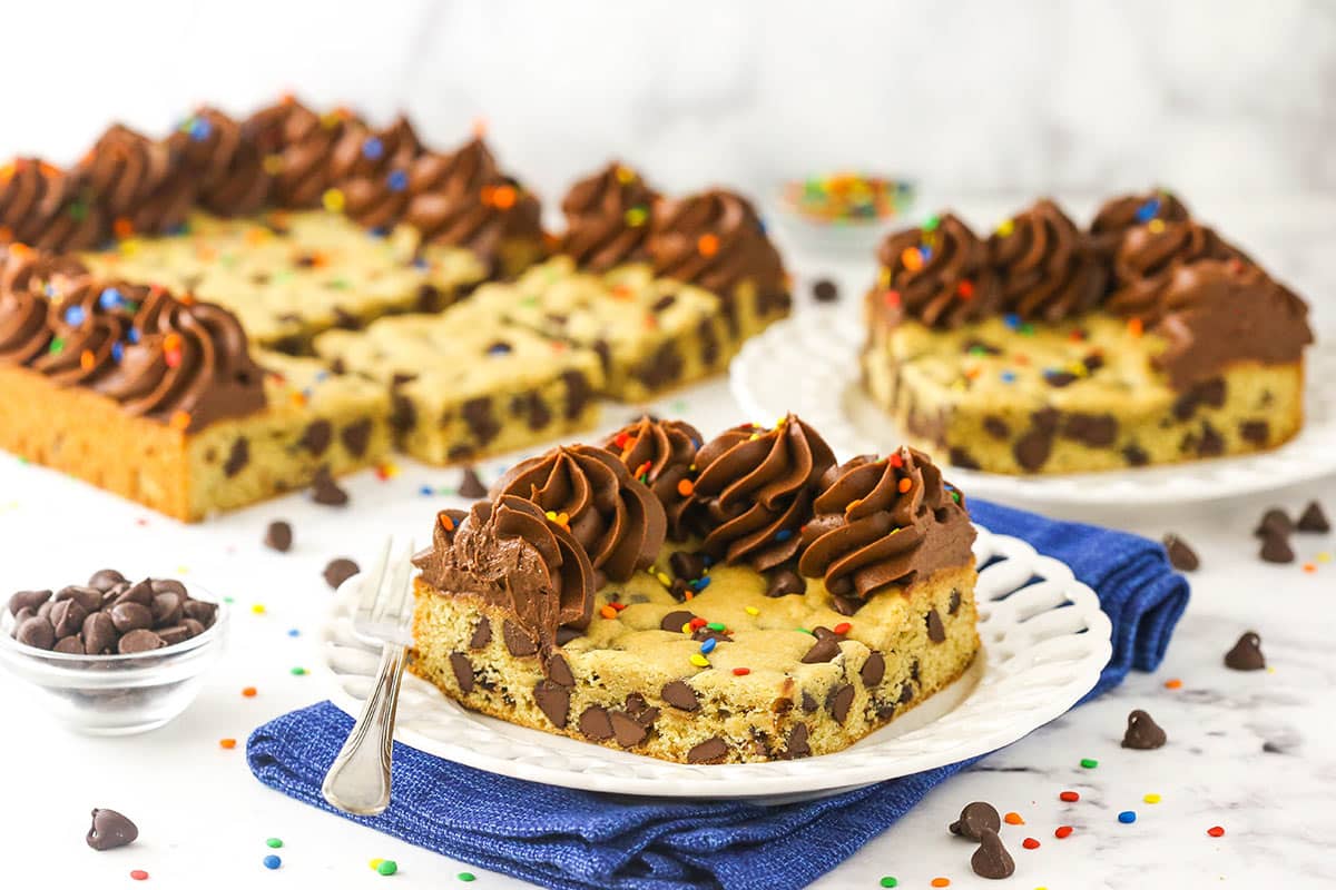 Questa densa e gommosa torta di biscotti in teglia è caricata di gocce di cioccolato e decorata con un bordo di glassa cremosa al cioccolato. È un regalo facile che è garantito per essere la vita di qualsiasi festa: fornisce molte porzioni e tutti lo adorano!