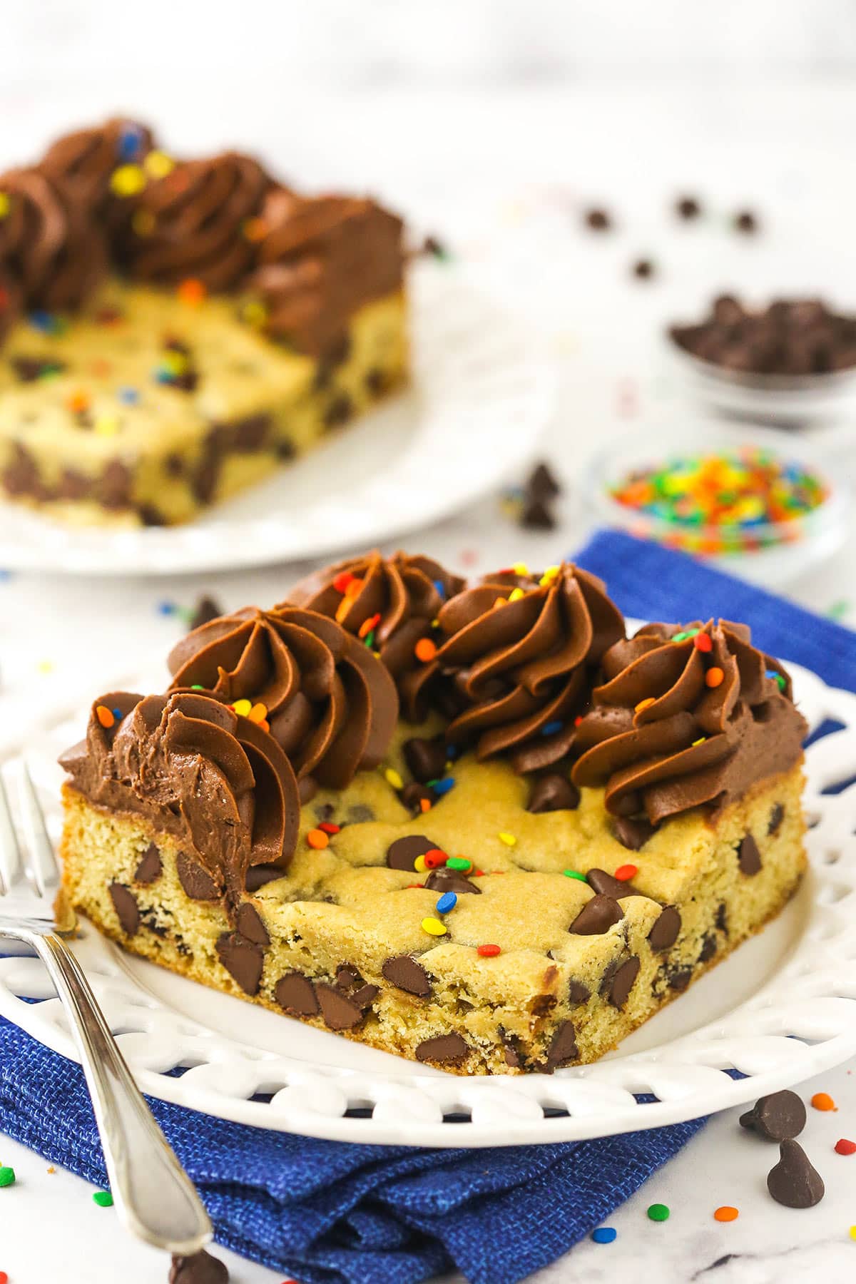 Questa semplice ricetta in teglia porta la mia classica torta biscotto con gocce di cioccolato al livello successivo di grandezza. Può soddisfare molti amanti dei biscotti con il minimo sforzo richiesto da parte tua! È il dessert perfetto per le feste per coloro che non amano eccessivamente la torta.