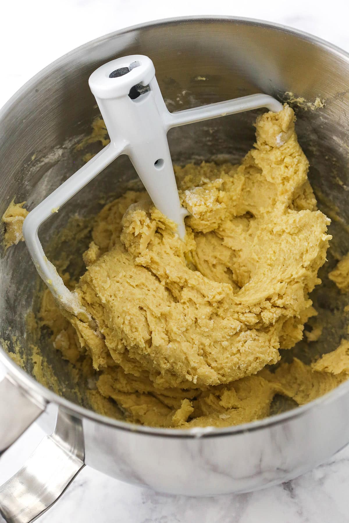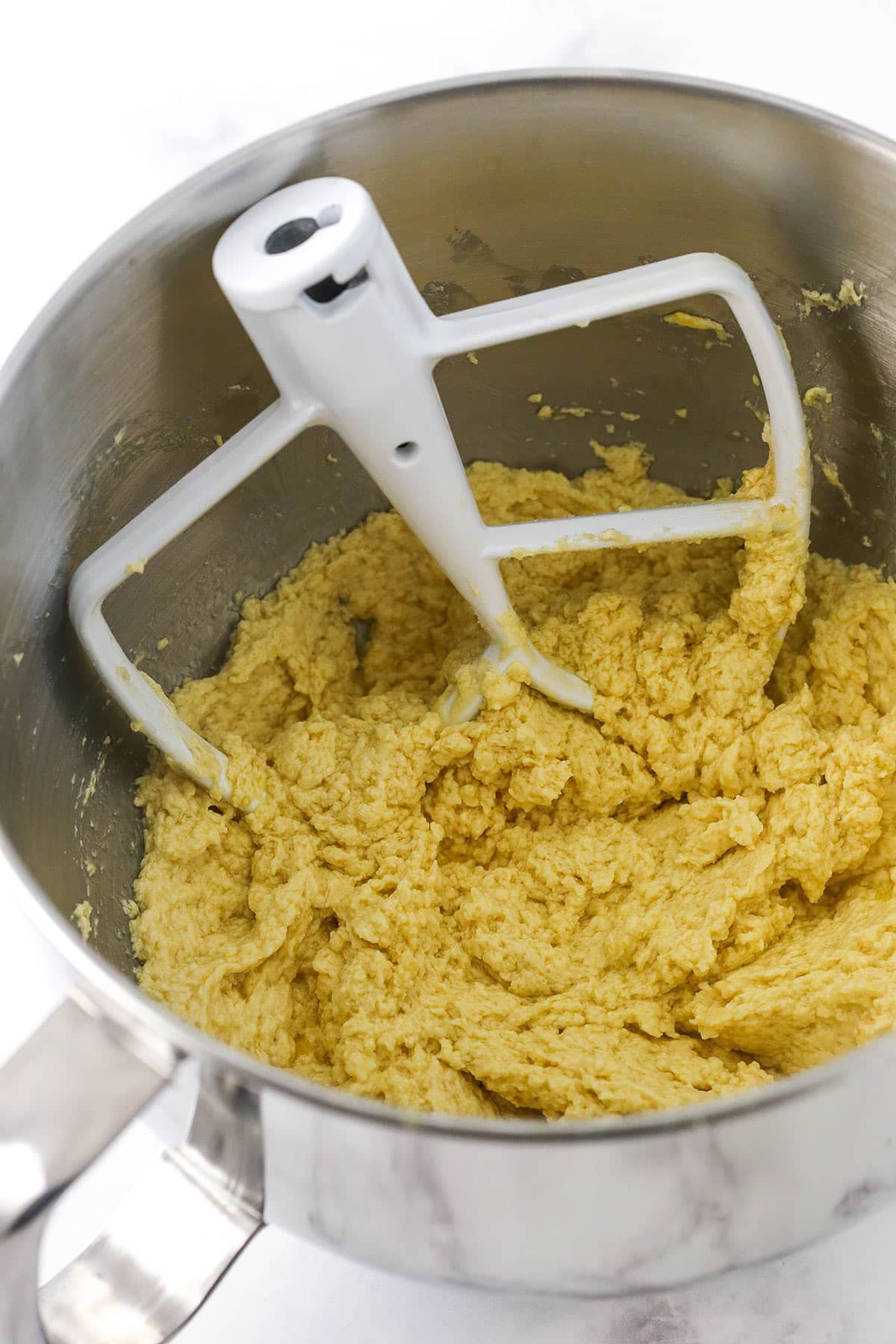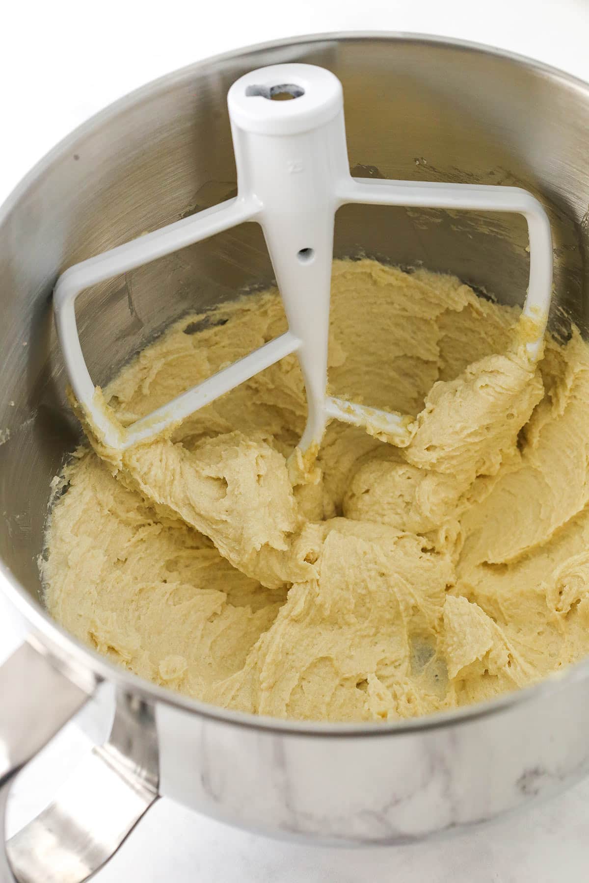 Crema di burro e zuccheri: Montare il burro e gli zuccheri in una ciotola capiente fino a ottenere un composto chiaro e spumoso, circa 2-3 minuti.