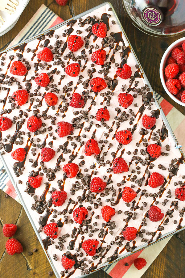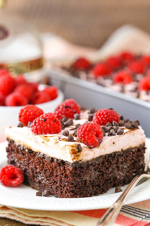 Questa torta bucherellata con Chambord al cioccolato e lamponi è realizzata con una torta al cioccolato super umida aromatizzata con liquore Chambord e imbevuta di ganache al cioccolato! È sormontata da una fresca panna montata al lampone e meravigliosamente leggera, fruttata e cioccolatosa! Deliziosa!