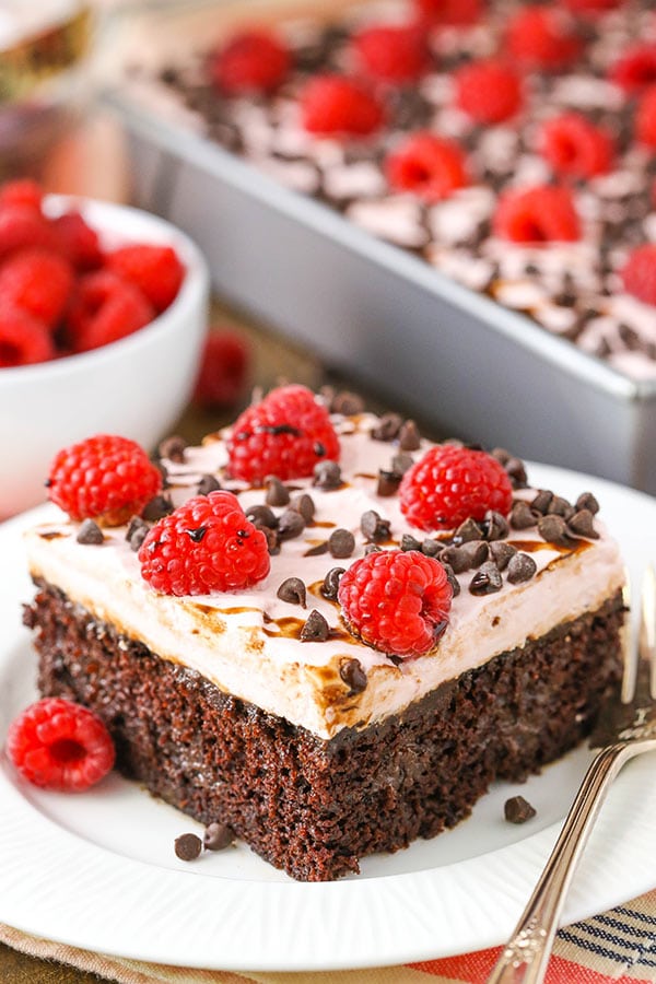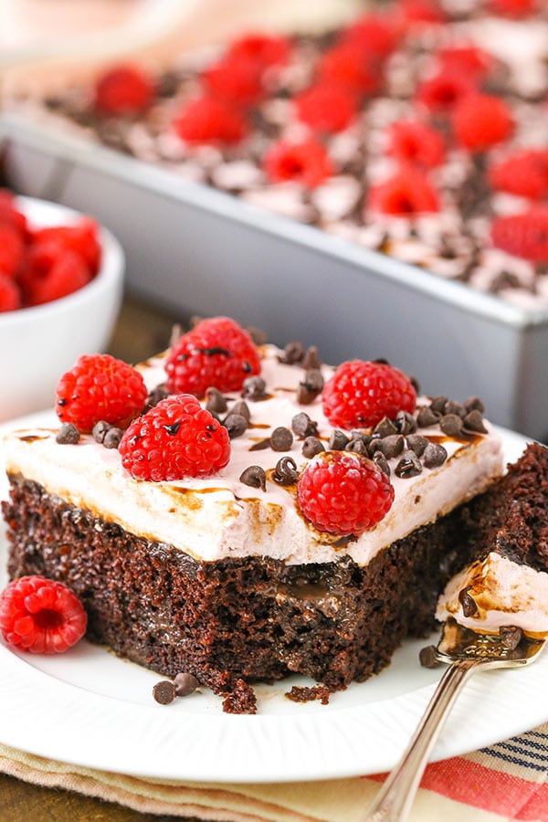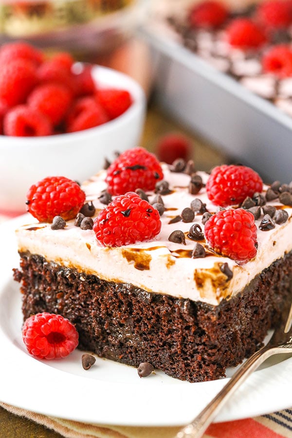 La torta finale è una meravigliosa combinazione di cioccolato, sapore di lampone chiodato e pop di lamponi freschi. Una torta così facile da fare con una grande ricompensa – perché non fare e godere?!