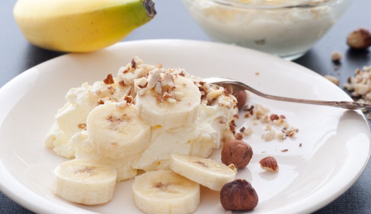 Sbucciate le banane, tagliatele a fettine sottili e frullatele nel mixer fino a ottenere una polpa, tenendola da parte. Tritate grossolanamente le nocciole con un coltello e mettete da parte anche queste.