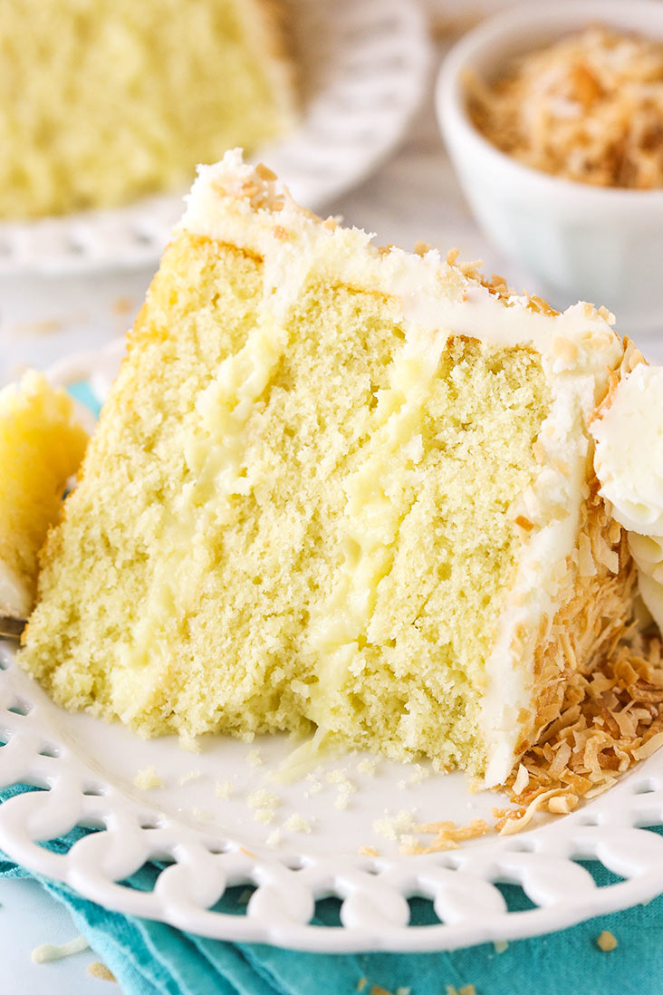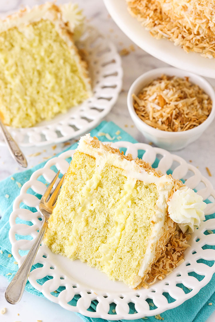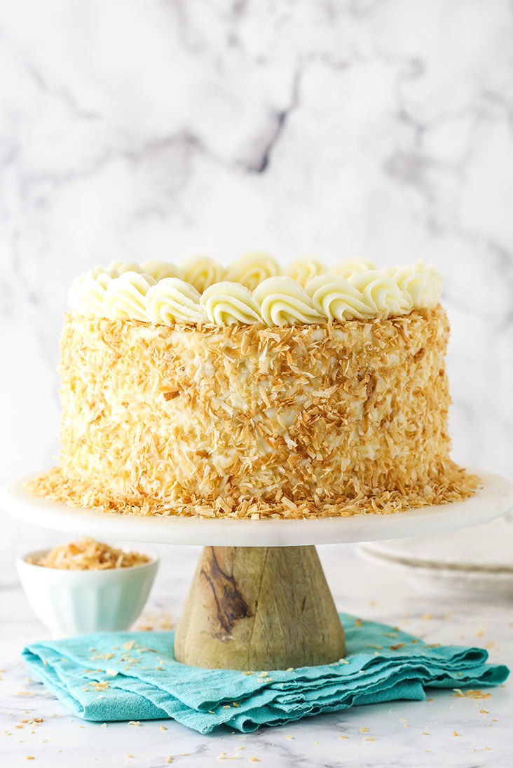 Questa torta è fantastica. Gli strati di torta al cocco sono teneri e umidi e realizzati con latte di cocco ed estratto di cocco per un sapore eccezionale. La crema al cocco è ricca e cremosa e facilmente la mia parte preferita di questa torta. E la glassa al formaggio cremoso si abbina perfettamente a tutto.