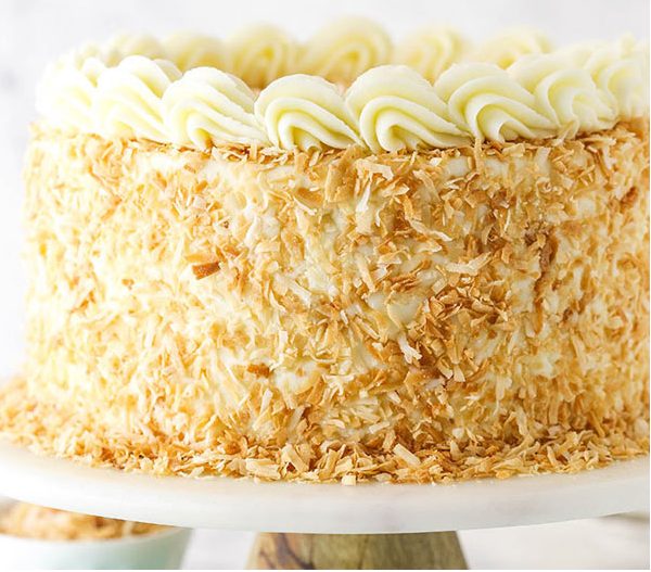 - Aggiungi lo strato finale e decora: Aggiungere lo strato finale di torta sopra e glassare la torta con la glassa rimanente. Pressa il cocco tostato sui lati della torta. Dovrai farlo subito dopo averla glassata in modo che la noce di cocco si attacchi. Disegna un bordo attorno al bordo superiore della torta usando la glassa rimanente.