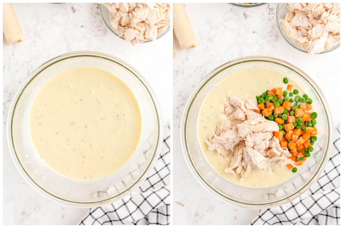 - Mescolare i piselli, le carote e il pollo. Mettere da parte.