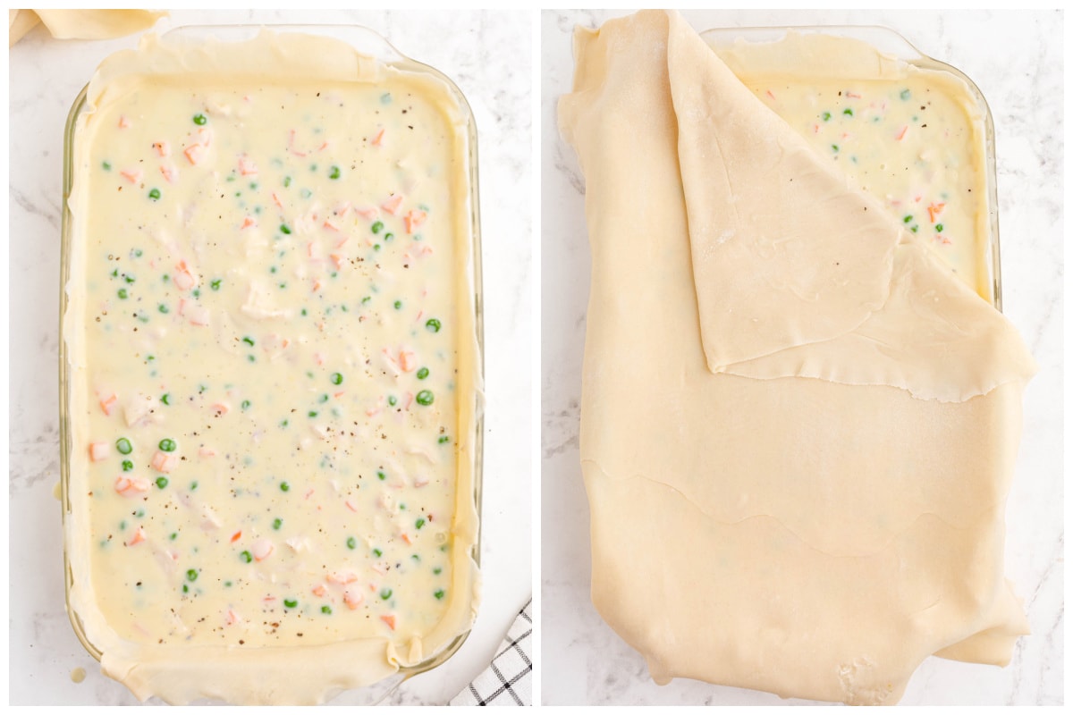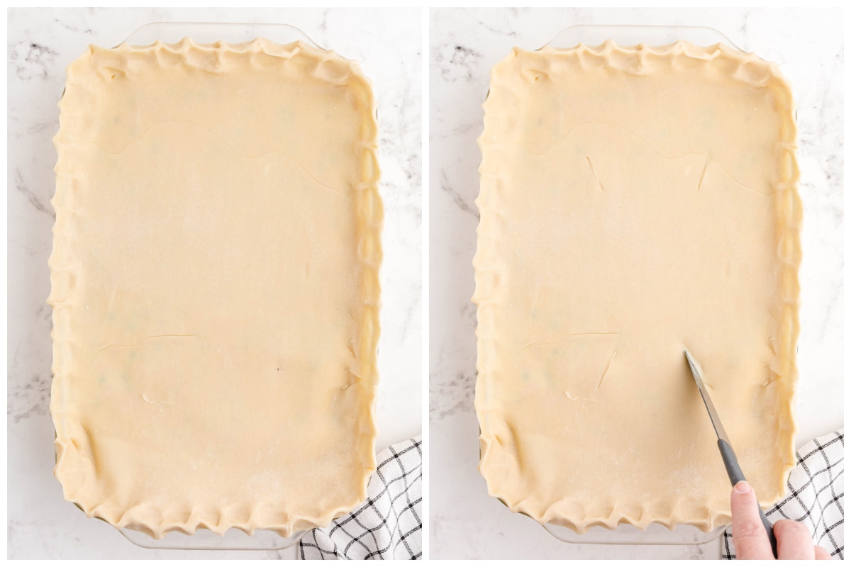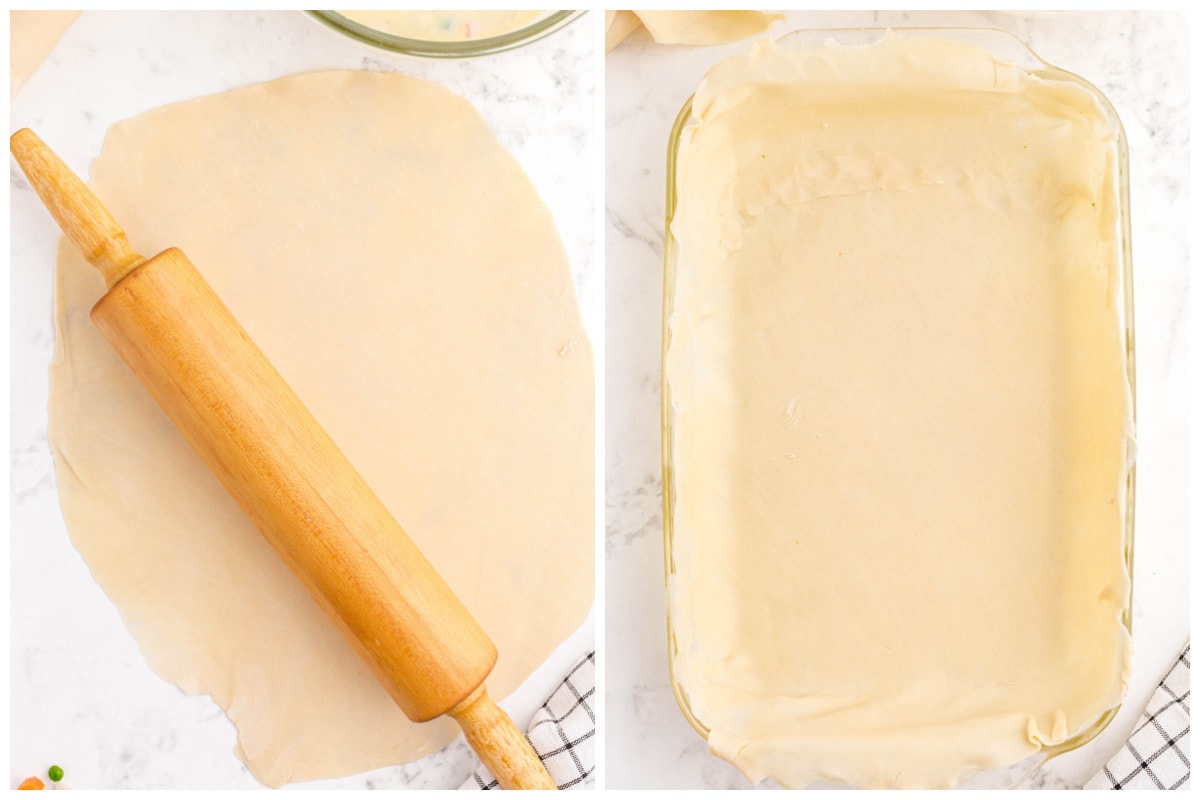 - Su una spianatoia leggermente infarinata srotolare la pasta frolla e arrotolarla delicatamente formando un rettangolo. Non arrotolare troppo sottile. Tagliare una crosta a metà. Aggiungere ogni mezza crosta su una crosta intera e rotolare delicatamente per fondere i bordi. Forma ogni nuova crosta in un rettangolo leggermente più grande di una teglia di vetro da 9×13 ” (22,86 cm x 30,02 cm).