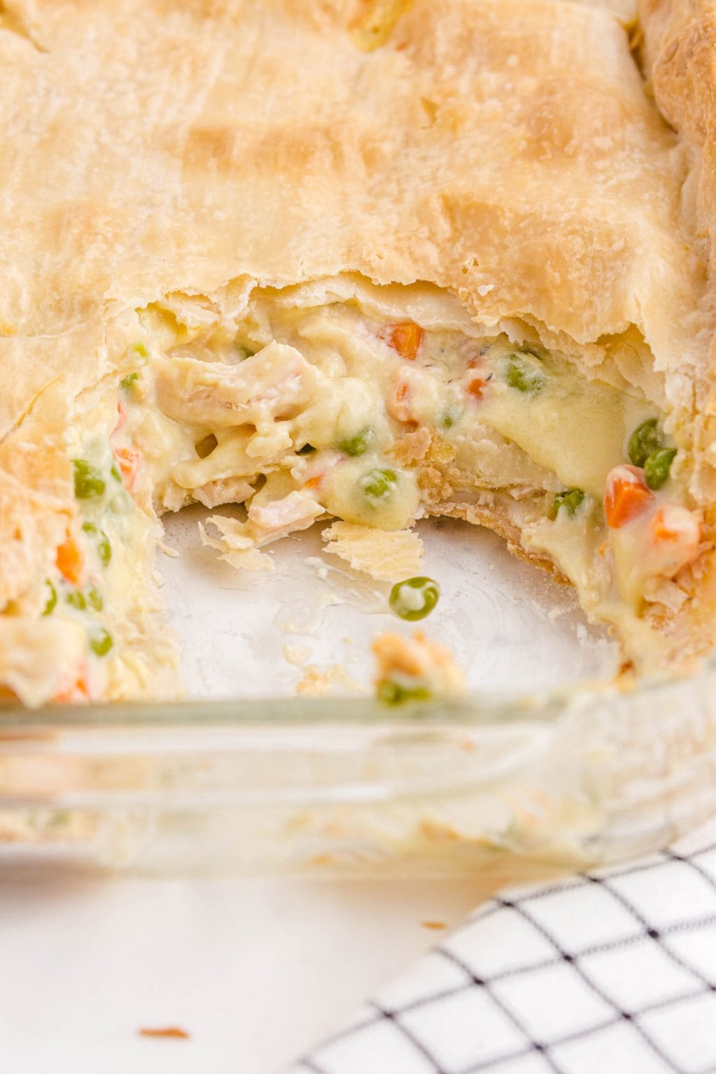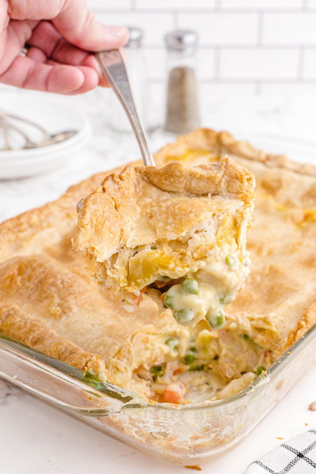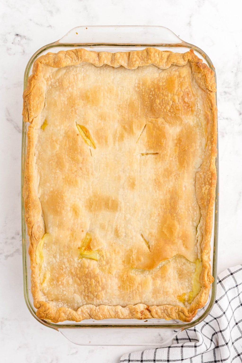 Questa semplice ricetta della torta di pollo cotta al forno nella teglia è caricata con il ripieno caldo e cremoso più gustoso mescolato con pollo grosso e verdure: è la combinazione perfetta di sapori e consistenze cotta tra due strati di crosta di torta friabile. E poiché usiamo una teglia invece di una tortiera, questa torta in pentola di grandi porzioni rende ancora più semplice cucinare cibi comodi in forma di casseruola in modo da poter sfamare facilmente una folla!