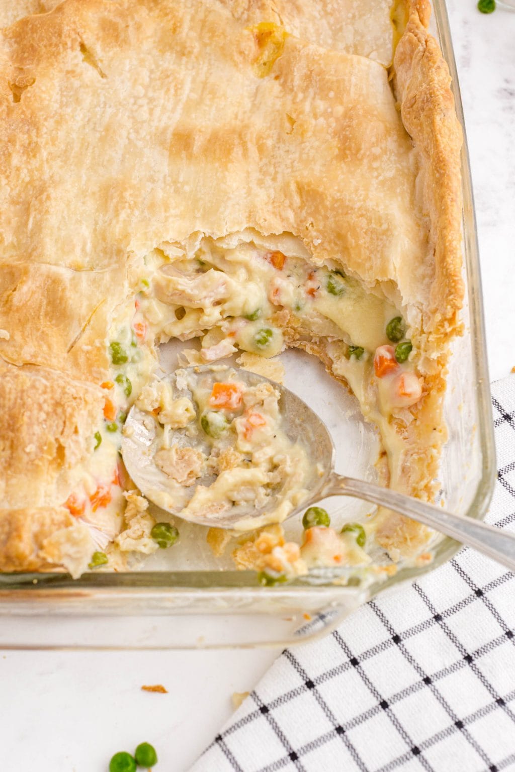 Questa torta di pollo cotta al forno nella teglia e fatta in casa è preparato con 7 semplici ingredienti in circa 20 minuti. L’uso di verdure surgelate, zuppa in scatola, crosta confezionata e pollo precotto rende una ricetta facile, gustosa e confortante con il nostro tocco unico su un preferito vecchio stile.