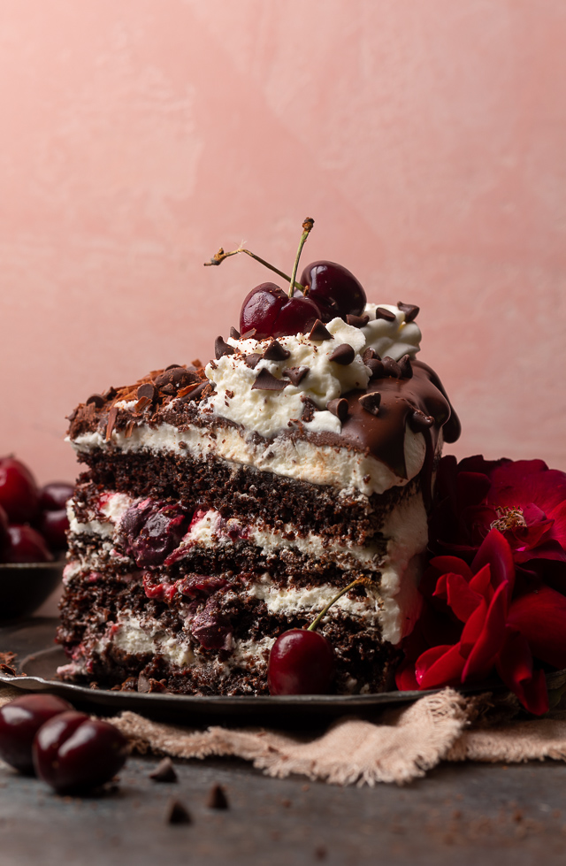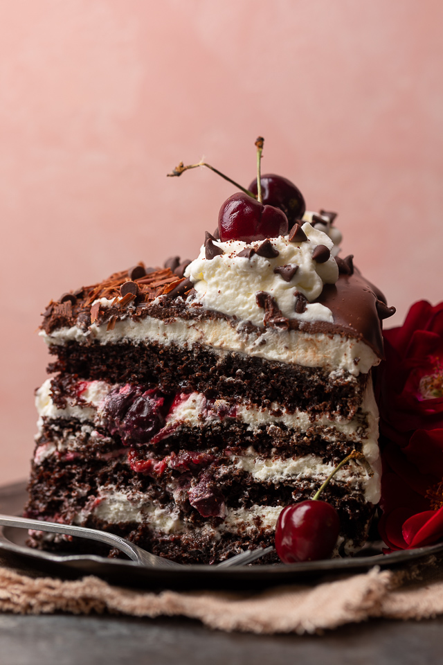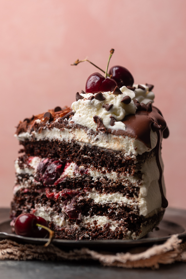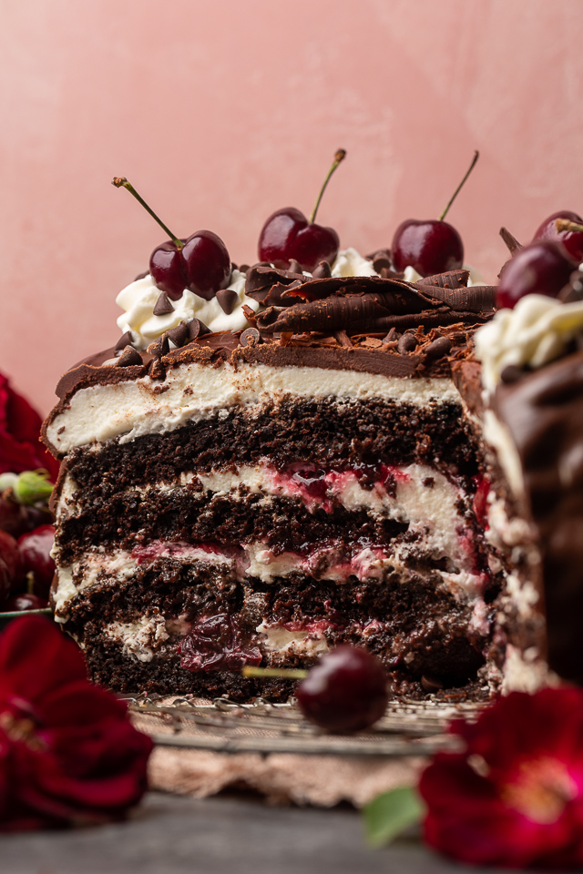 - A differenza della maggior parte delle torte a strati che utilizzano una glassa al burro o al formaggio cremoso, questa torta è sormontata da una panna montata leggera e ariosa. Non è troppo dolce e lascia davvero brillare i sapori di cioccolato e ciliegia!