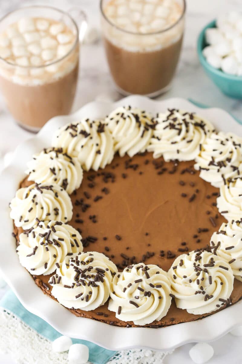 Questa torta gelato al cioccolato caldo Baileys è un dessert facile con un gelato al cioccolato Baileys senza gelatiera ricoperto di marshmallow! È come mangiare una cioccolata calda congelata a forma di torta – con un calcio!