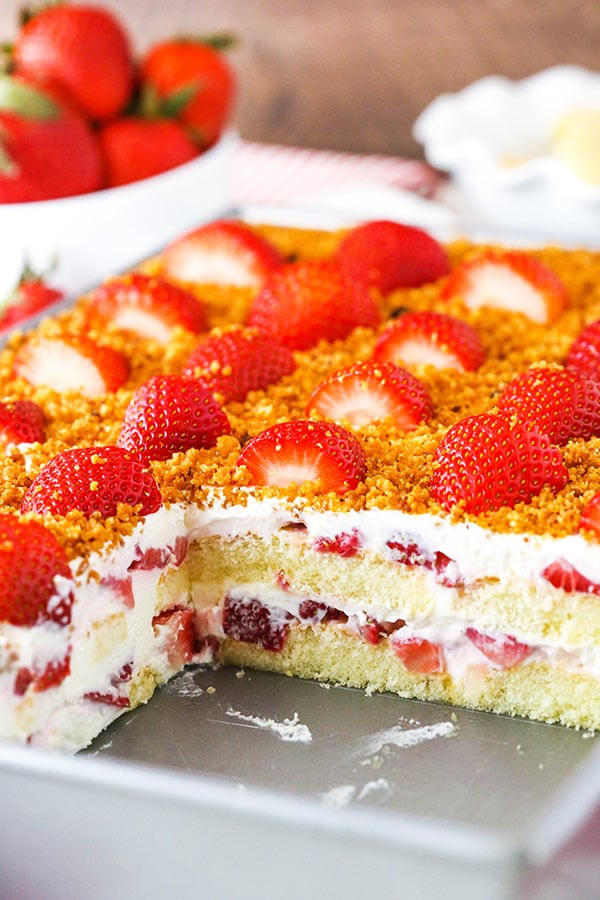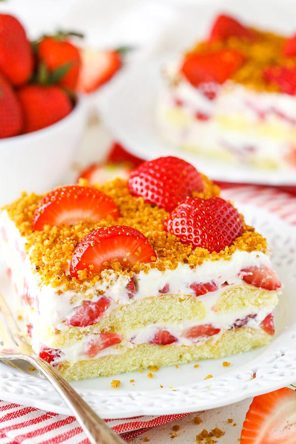 I savoiardi sono utilizzati tra gli strati di ripieno per imitare la parte di frollino di fragola. Sono perfetti in questo dessert perché sono morbidi e simili a torte, ma non devi preoccuparti di cuocerli! Lo adoro!