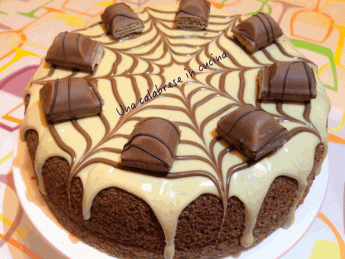 Al momento di servire. capovolgiamo lo stampo su un piatto da portata, rimuoviamo con delicatezza dalla torta i blocchetti di cartone e, se necessario, tagliamo la pellicola che la avvolge. Rimuoviamo una per volta le mezzelune. Con un cornetto di carta forno riempito con il resto del cioccolato fuso, realizziamo le decorazioni classiche del dolce sulla superficie. Servite a fette.
