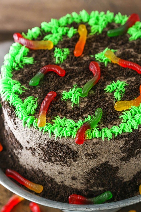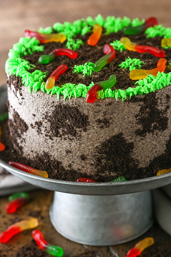 Devo darle un po’ di merito per come questa torta ha preso forma. Le stavo scrivendo e chiedendo le sue preferenze mentre lo facevo, poiché questa torta era in gran parte per lei. Ho pensato che se ama così tanto la torta terra, ne saprà di più. Ha scelto una glassa a base di vaniglia piena di Oreo e voleva sicuramente dei vermi gommosi tra gli strati della torta. Devo ammetterlo, adoro il modo in cui è andata a finire! Vermi gommosi e tutto il resto!