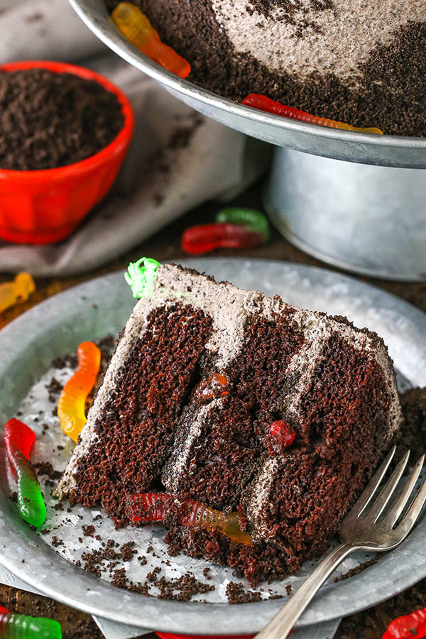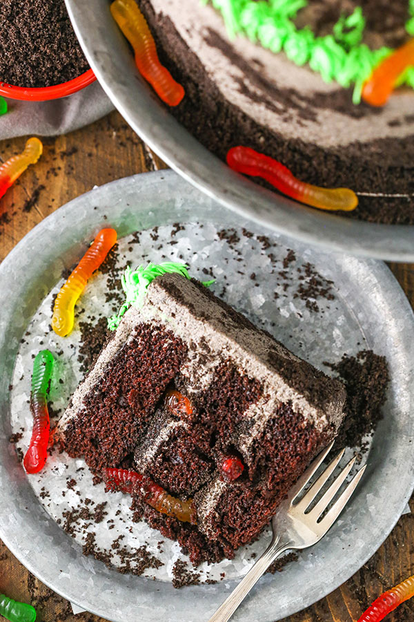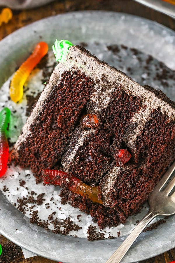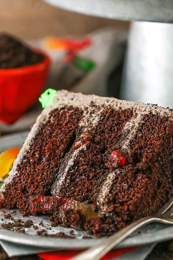 Anche stratificato nella torta è molto probabilmente la mia parte preferita – i vermi gommosi! Definiscono totalmente una buona e divertente torta di terra, quindi dovevano essere inclusi in questa. Non ero del tutto sicuro di come si sarebbe affettata la torta con i vermi gommosi nel mezzo, ma in realtà è stata tagliata benissimo! E anche se non vuoi aggiungerne troppi e fare in modo che travolgano la torta, sono stati un’aggiunta gustosa e divertente.