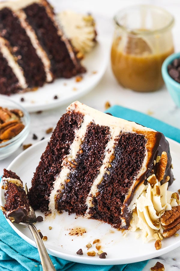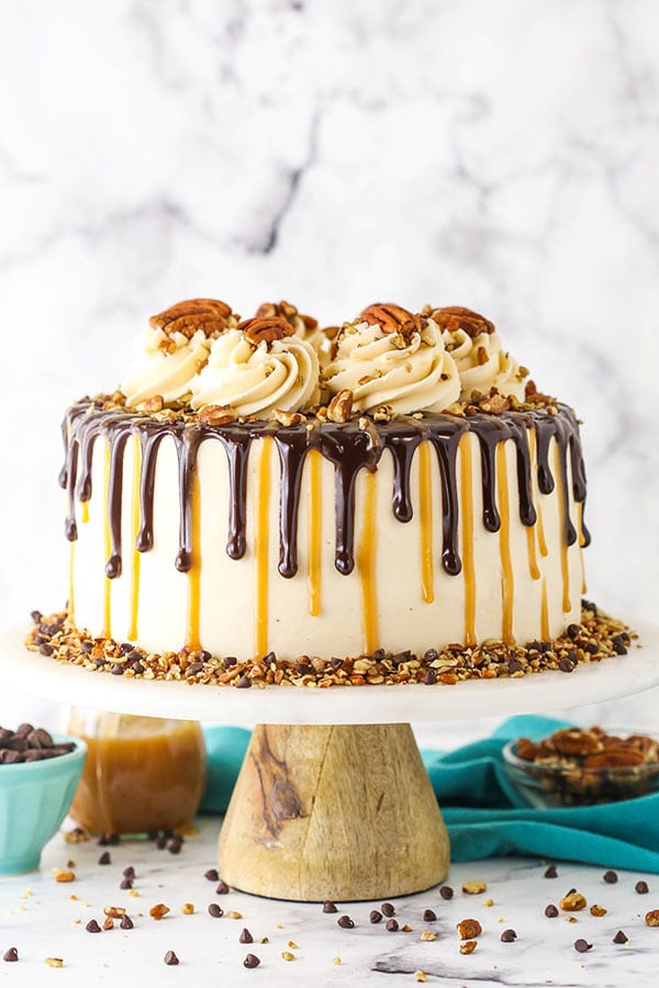 Questa torta ha così tanto da offrire. Non solo è fatta con la mia migliore ricetta preferita torta al cioccolato come base, ma è piena di caramello, cioccolato e noci pecan. Cosa c’è da non amare?