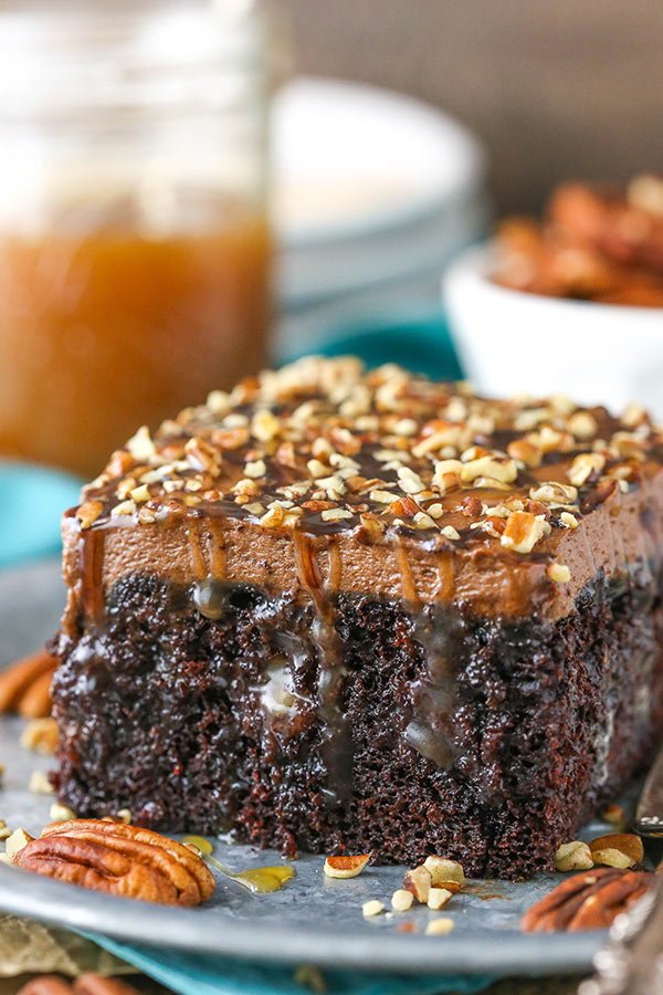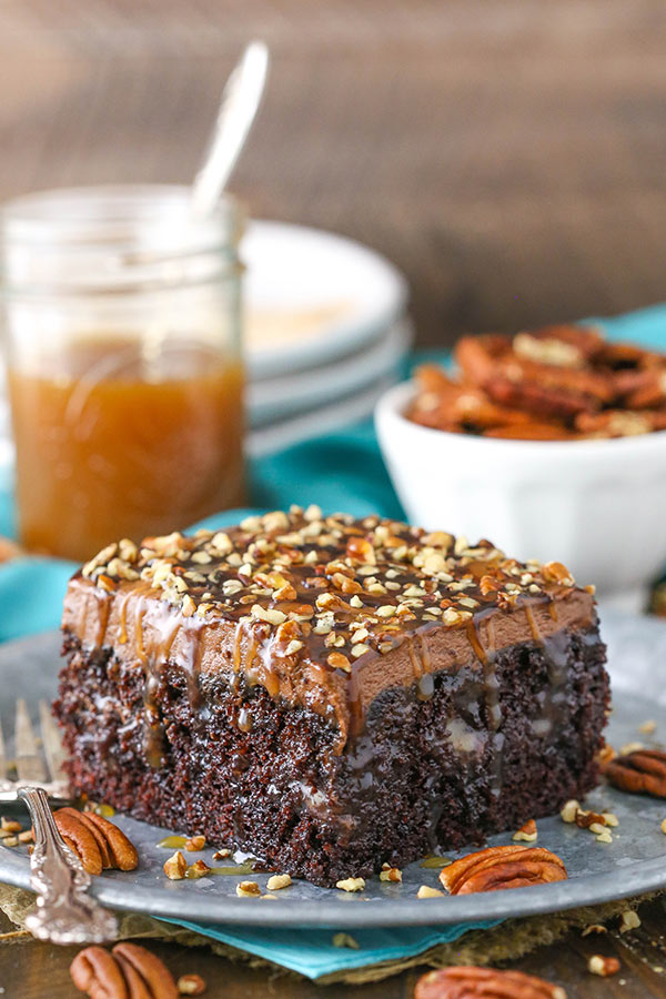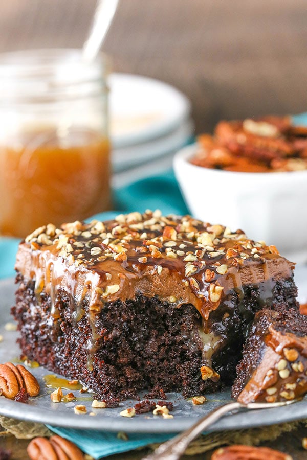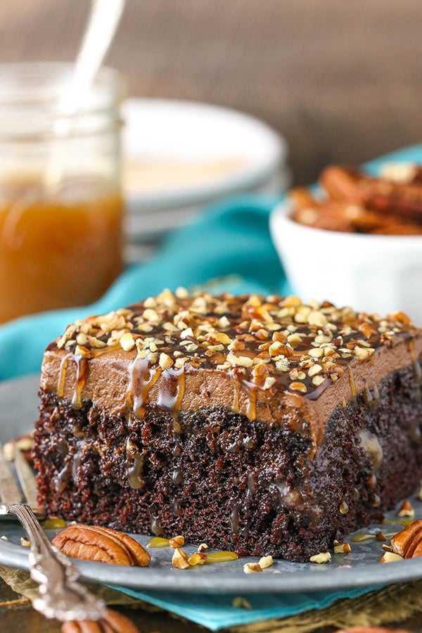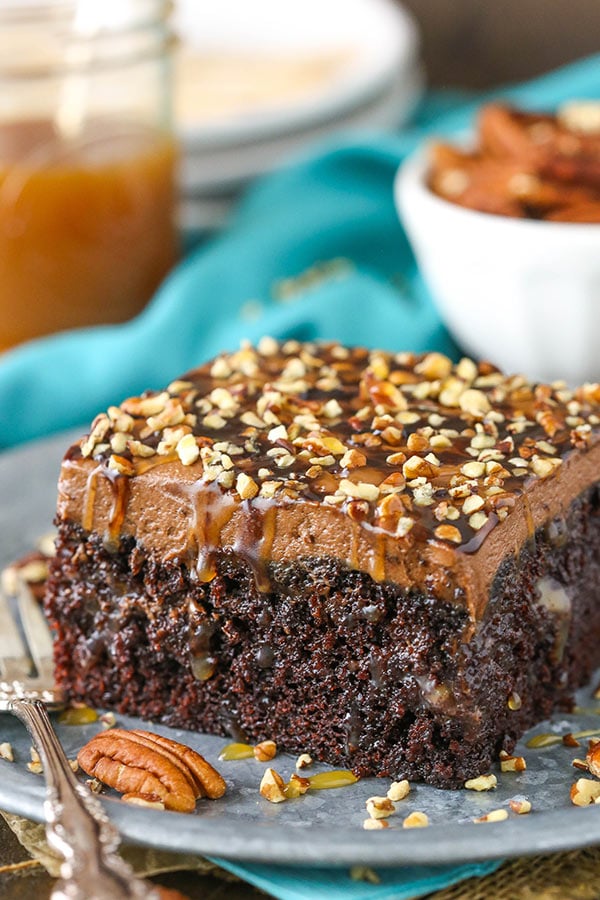 L’intera torta è terminata con un filo di cioccolato e salsa al caramello e, naturalmente, noci pecan tritate. Se non l’ho detto abbastanza, questa torta è INCREDIBILE! Ricco, umido, pieno di cioccolato e caramello. È come il paradiso delle torte e di sicuro ne hai bisogno.
