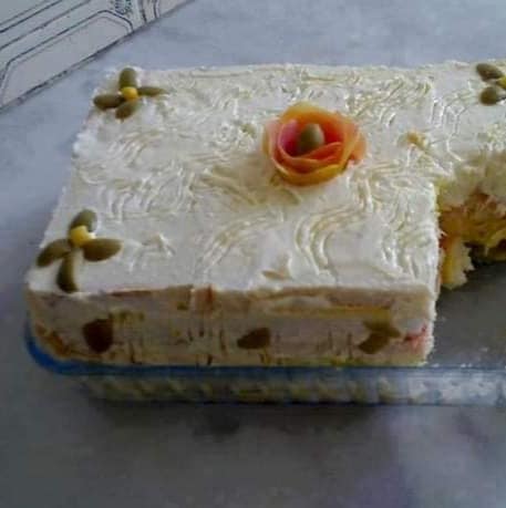 - Montaggio torta senza crosta, salsa verde, salsa rossa, salsa gialla, ripetendo gli strati. Decorare con purea mista a maionese o solo maionese Decorare anche con olive e fiori di pomodoro.