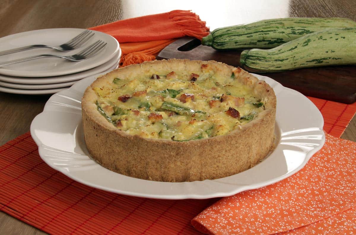 - Per il ripieno: in una padella, fate soffriggere la pancetta nel suo stesso grasso, a fuoco medio fino a quando non inizia a dorarsi. Aggiungere la cipolla e l’aglio e far rosolare per 3 minuti. Aggiungere le zucchine e far rosolare per 5 minuti, mescolando di tanto in tanto. Fate raffreddare e amalgamate la panna e le uova. Condite con sale e pepe e tenete da parte. Stendete la pasta con l’aiuto di un mattarello e foderate uno stampo da 22 cm di diametro. Stendere il ripieno sull’impasto, spolverizzare con parmigiano, eliminare l’eccesso e cuocere in forno medio preriscaldato per 30 minuti o fino a doratura. Fate raffreddare, sformate e servite.