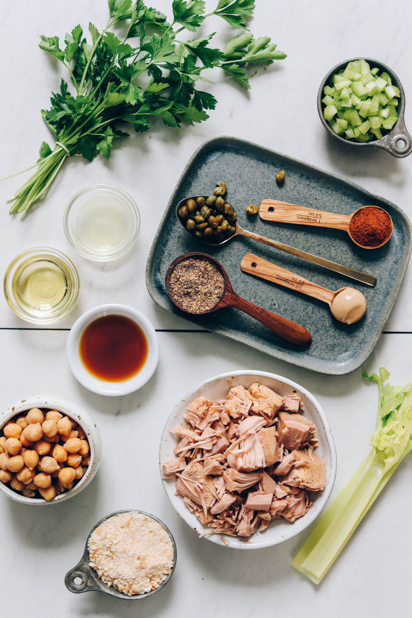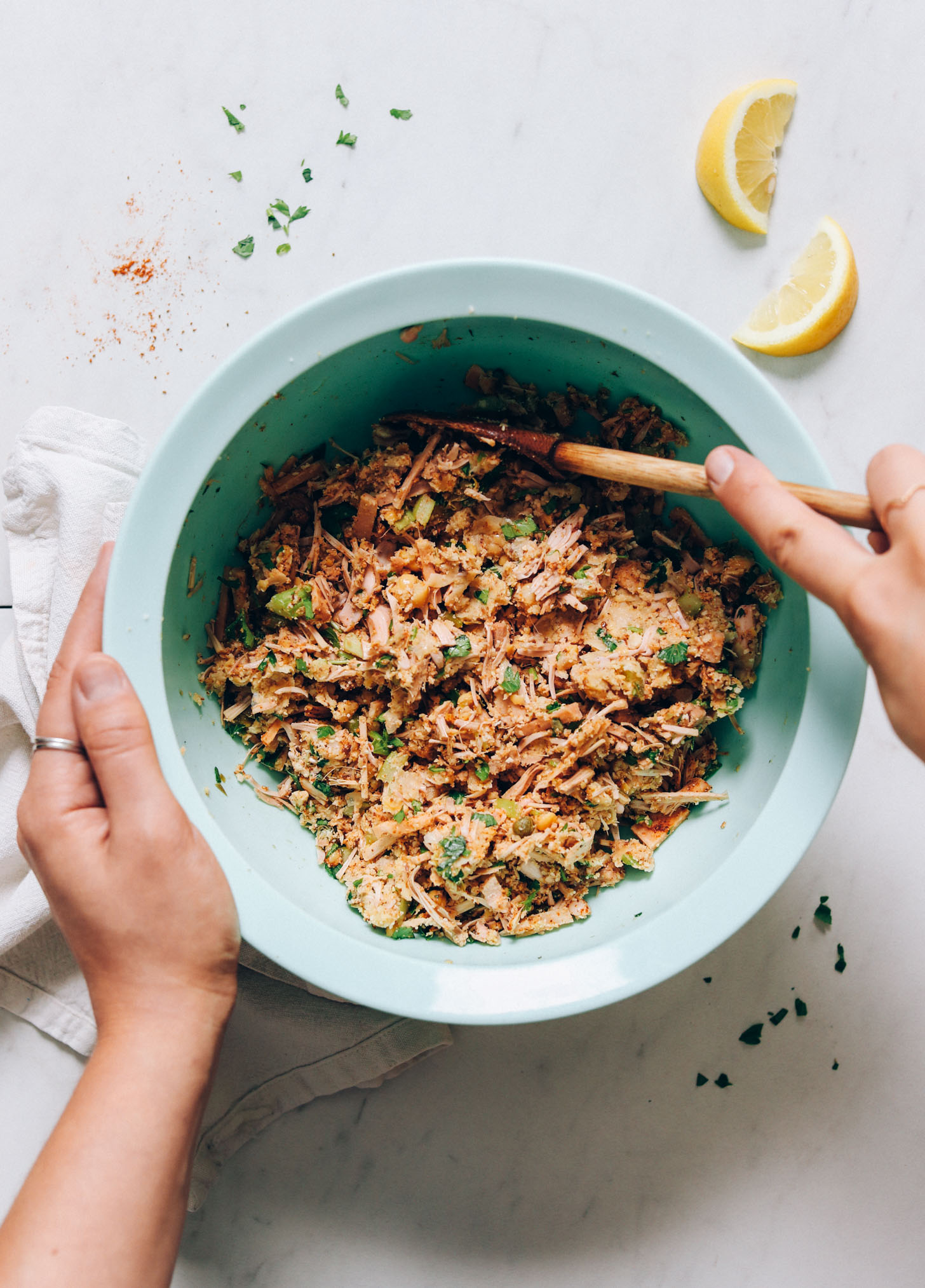 Abbiamo incluso molti dei sapori delle tradizionali torte di granchio, tra cui condimento Old Bay, Worcestershire, senape di Digione, succo di limone e prezzemolo. E abbiamo anche aggiunto il sedano per un sottile croccante e i capperi per un elemento salato che ricorda i frutti di mare.