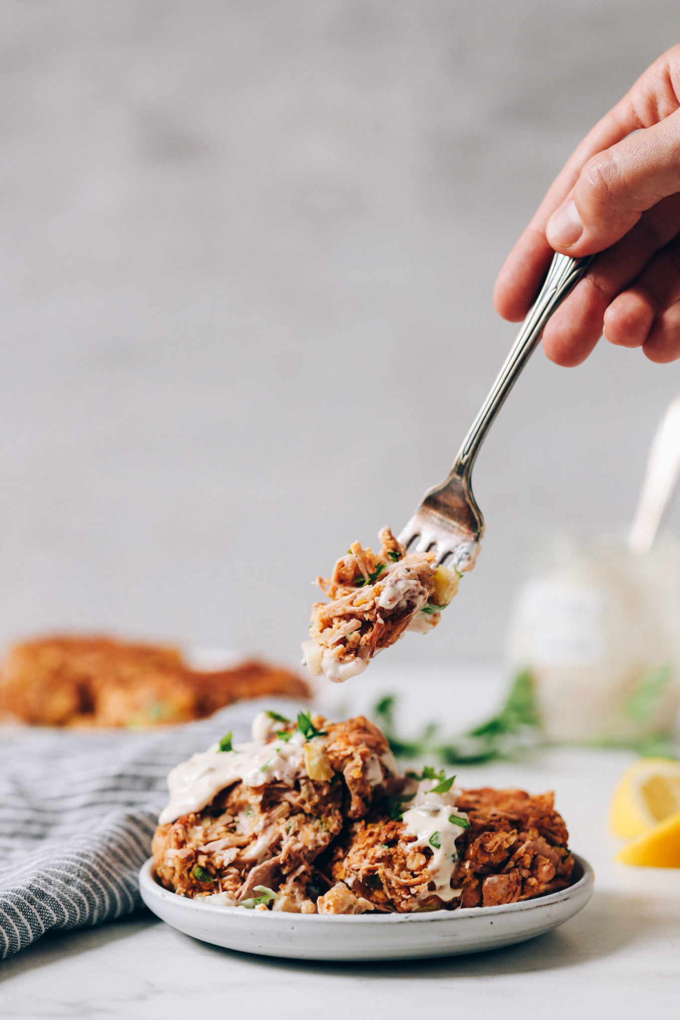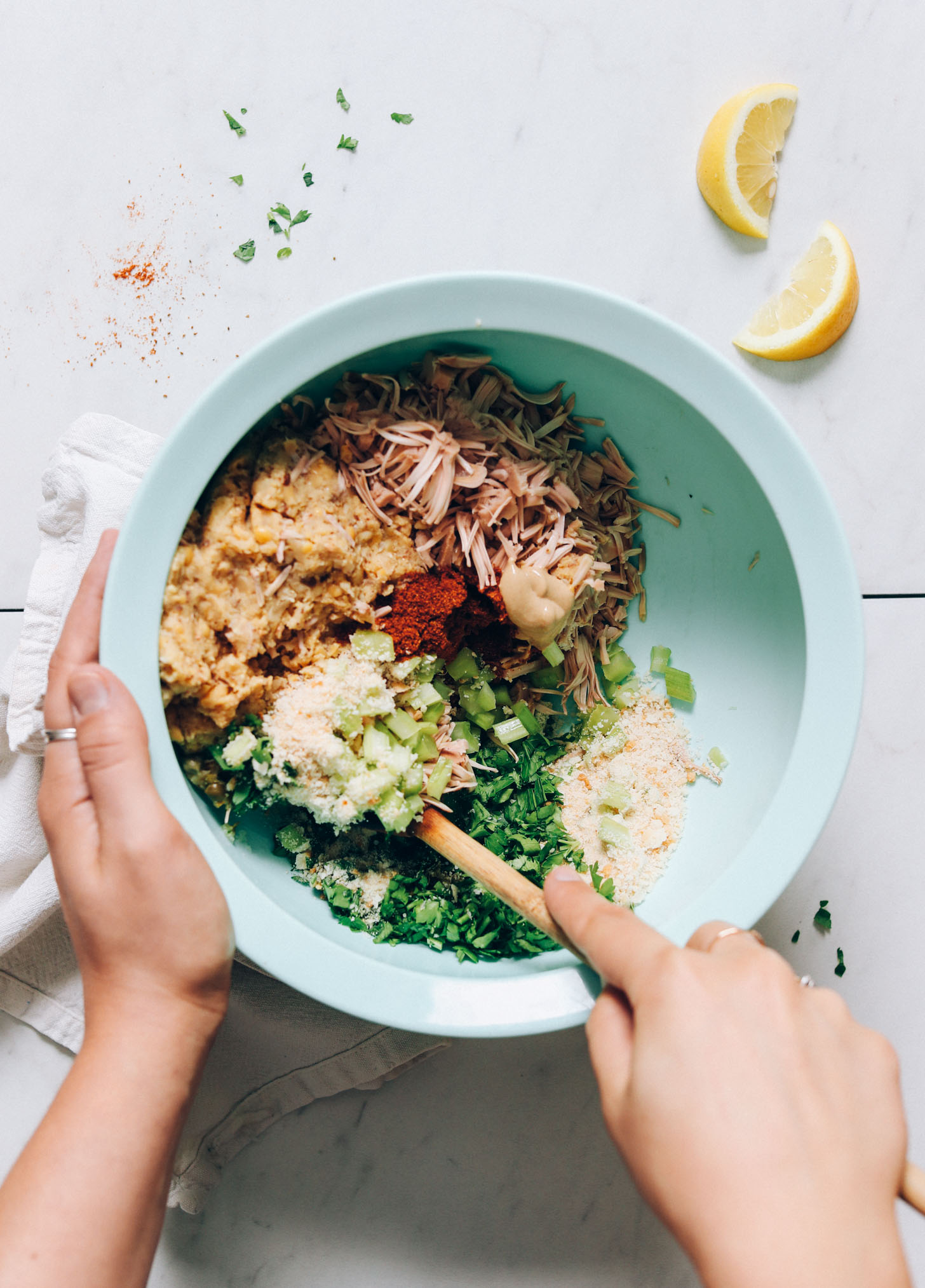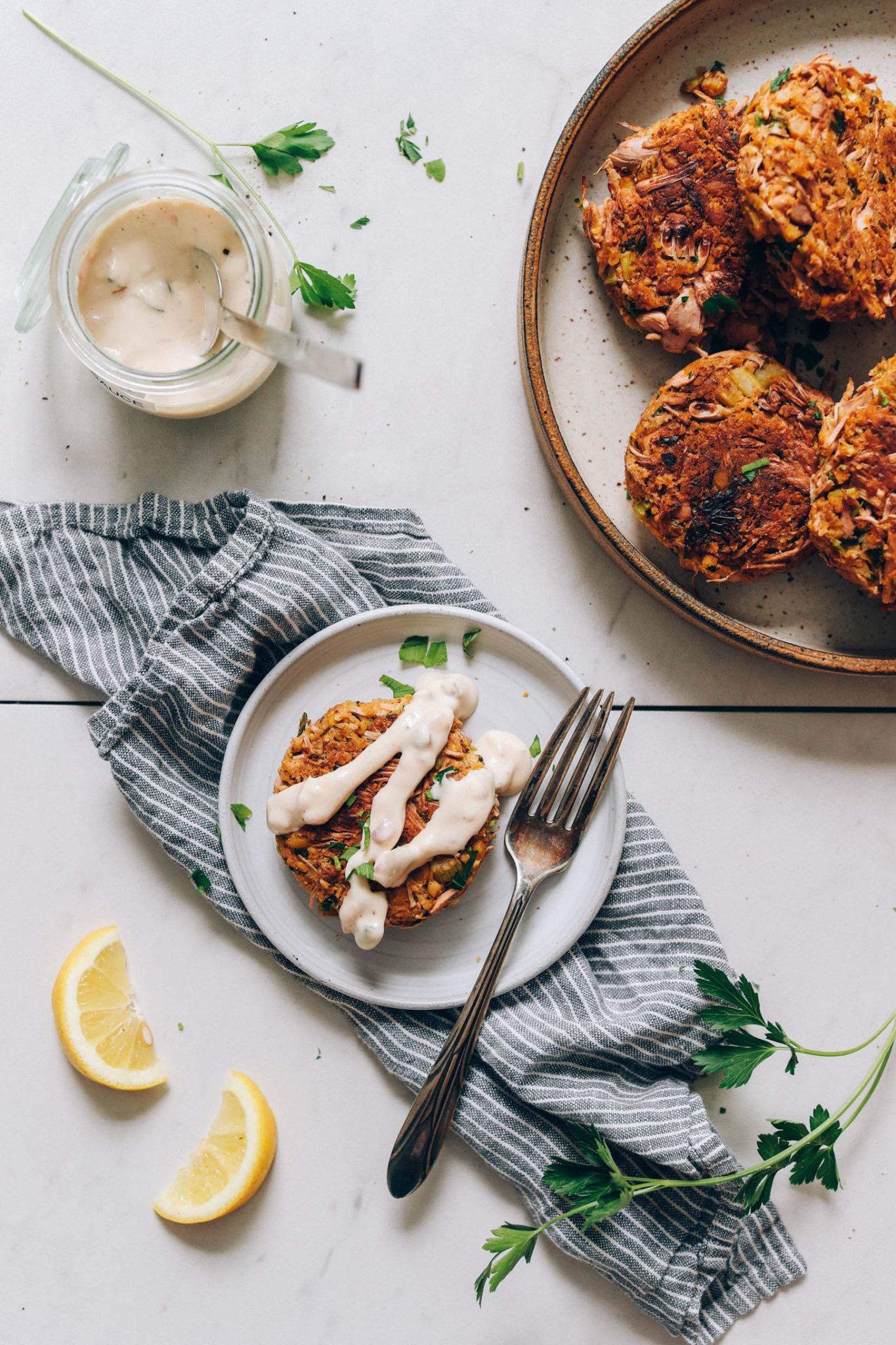 La base di queste torte di granchio vegane è una miscela di giovane jackfruit verde per la sua consistenza sminuzzata e ceci per un apporto proteico che li porta in una terra favorevole agli antipasti.