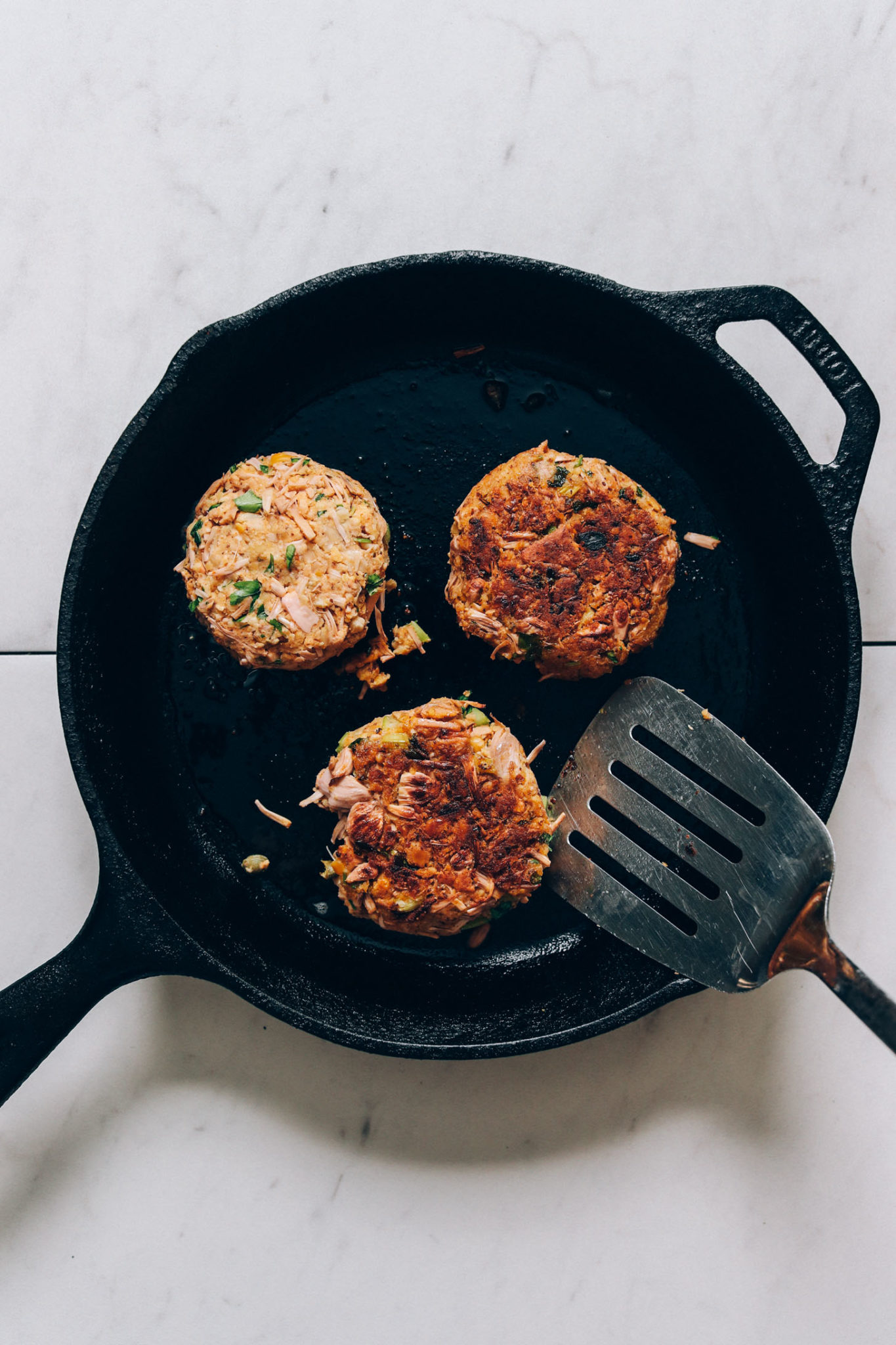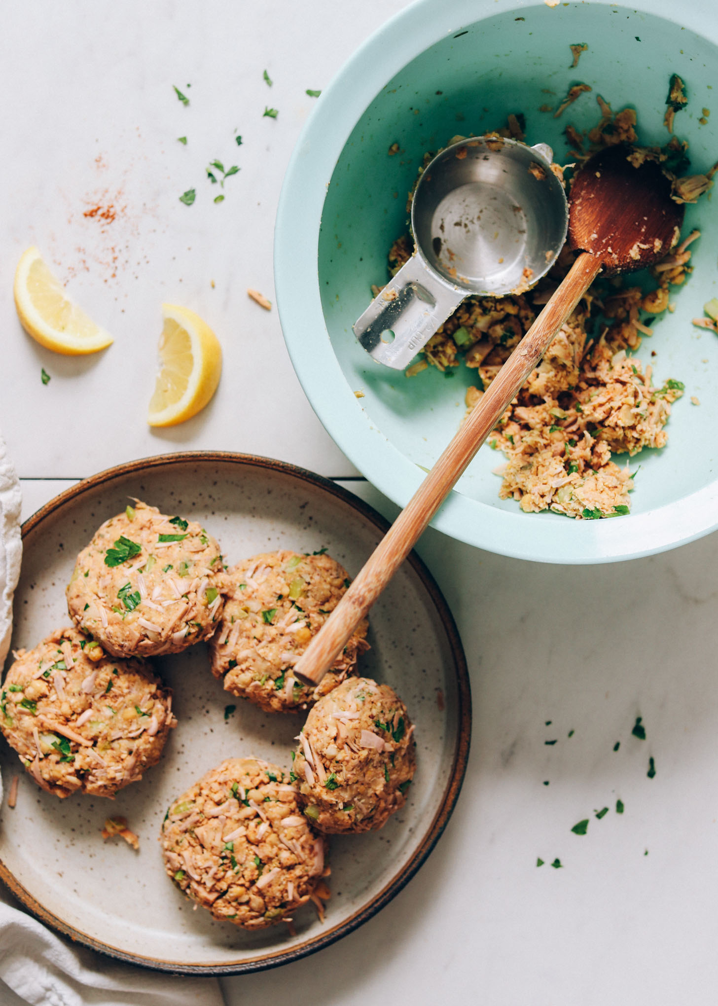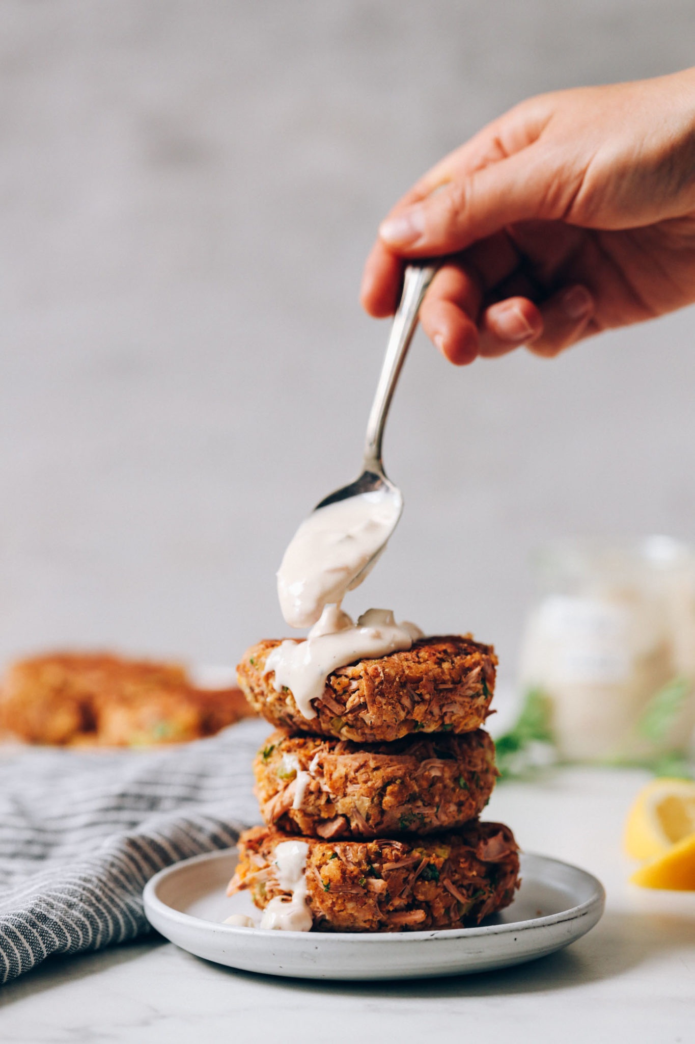 La base di queste torte di granchio vegane è una miscela di giovane jackfruit verde per la sua consistenza sminuzzata e ceci per un apporto proteico che li porta in una terra favorevole agli antipasti.