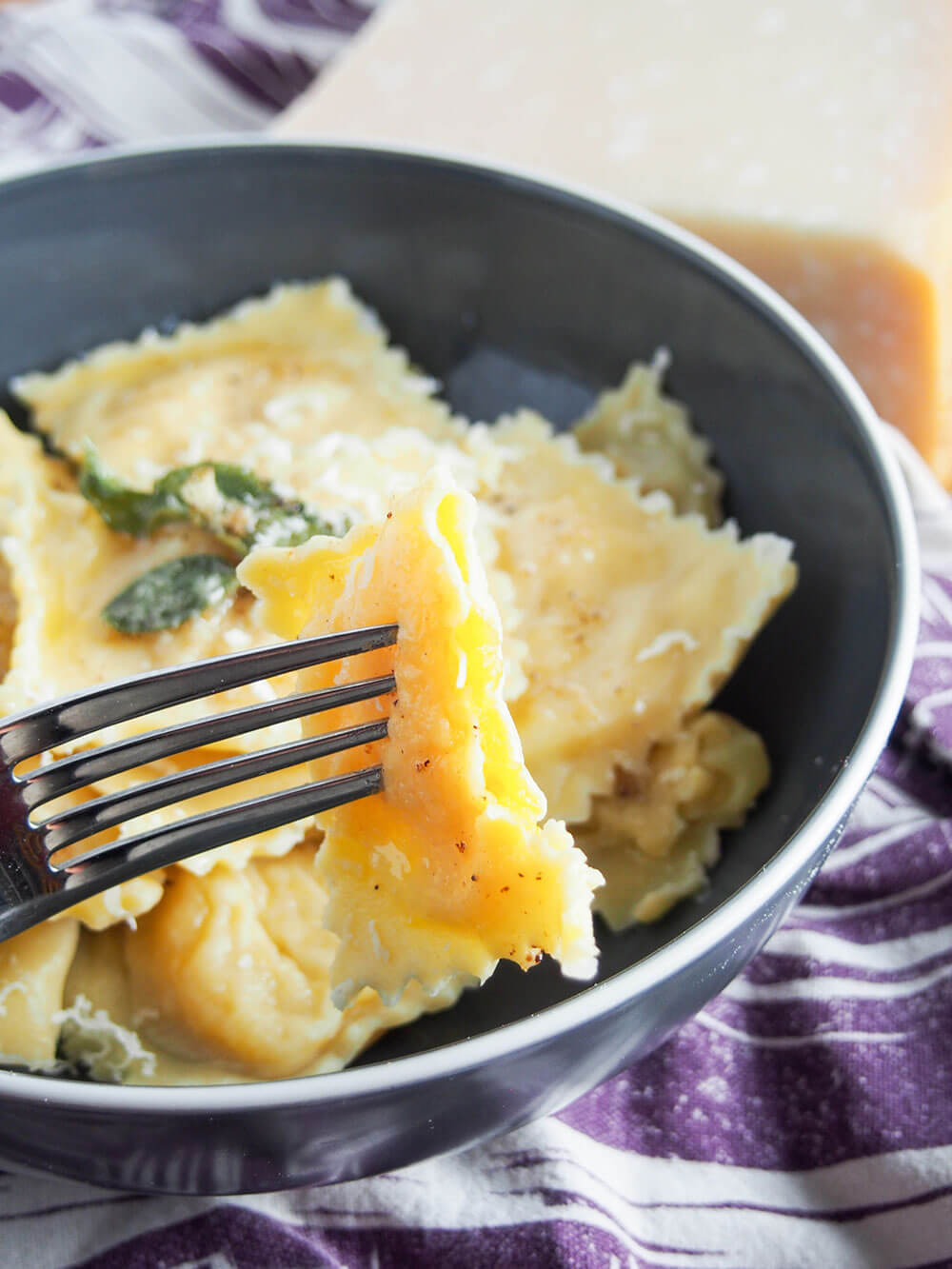 Preparate il ripieno il giorno prima. Tagliate a pezzi la zucca con la buccia, eliminate i semi e i filamenti, e mettetela in forno a 180°C per 10 minuti. Passate la polpa al setaccio; in una terrina amalgamate alla purea di zucca gli amaretti ridotti in polvere, la mostarda tritata fine, un paio di cucchiai del suo sugo, 4 cucchiaiate di parmigiano, la scorza grattugiata e il succo del limone. Salate, pepate, mescolate bene e tenete coperto al fresco. Se prima di usarlo il ripieno non risultasse asciutto, aggiungete ancora qualche amaretto. Preparate la sfoglia, quindi con l’apposita rotella tagliatela a strisce, distribuite su metà delle sfoglie il ripieno a mucchietti distanziati, poi ricoprite con l’altra metà delle strisce, premete con le dita intorno al ripieno per saldare la pasta, avendo cura di eliminare tutta l’aria, e tagliate i tortelli con la rotella. Lessateli in acqua bollente salata e, appena la pasta sarà cotta, scolateli col mestolo bucato, mettendoli a strati in una zuppiera calda, coperti con burro fuso, aromatizzato con la salvia e parmigiano grattugiato.