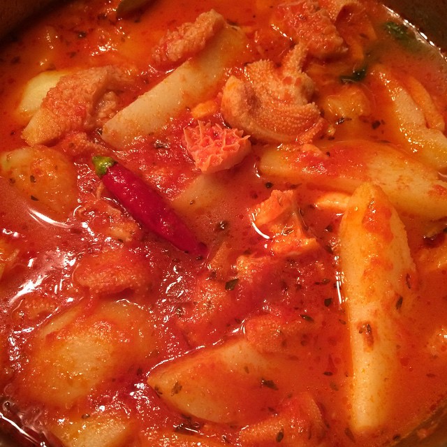 Per prima cosa mettiamo a lessare le patate in acqua calda. Quando sono lessate scoliamole e mettiamole in una pentola. Lavate con molta cura e forza la trippa, strofinandola con sale e risciacquandola molte volte. Mettetela poi in acqua bollente, lasciatela cuocere e scolatela al dente. Tagliatela a striscioline o a pezzetti e mettetela a soffriggere nell’olio e nell’aglio. Quando sarà ben rosolata, versate nella casseruola i pomodori pelati, gli altri aromi e un po’ di acqua bollente. A questo punto potete inserire le patate precedentemente lessate. Fate cuocere a fuoco moderato e con il coperchio, unendo, se necessita, altra acqua. A cottura ultimata spolveratela con pecorino o parmigiano e servitela ben calda.