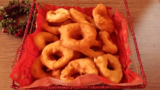 Lavate e lessate le patate, poi scolatele e sbucciatele. Schiacciate le patate con lo schiacciapatate, raccogliendo la purea in una grande ciotola e aggiungete la farina, il lievito di birra, sciolto in una parte di acqua con il sale, e iniziate a mescolare gli ingredienti aggiungendo l’acqua poco per volta, fino a raggiungere una consistenza morbida. Proseguite impastando con le mani fino a ottenere un composto omogeneo e liscio, aggiungendo un po’ di farina quando è necessario. Le patate sono appiccicose e ogni tanto vi dovete infarinare le mani per lavorare bene l’impasto. La quantità di acqua dipende dal grado di assorbimento della farina e dalle patate che utilizzate, quindi bisogna regolarsi aumentando o diminuendo la quantità d’acqua indicata fino a ottenere l’impasto morbido e omogeneo. Quando l’impasto non si attacca più alle mani è pronto per lasciarlo lievitare. Ponete l’impasto sulla spianatoia e copritelo con un grande strofinaccio o tovaglia, lasciandolo riposare in un luogo caldo e privo di corrente per circa 2 o 3 ore. Una volta che l’impasto è raddoppiato, tagliate delle strisce larghe 3-4 cm e formate delle piccole ciambelle, secondo la grandezza che volete ottenere. Poi, arrotolate l’impasto con le mani infarinate sulla spianatoia, anch’essa leggermente infarinata, poiché l’impasto è piuttosto appiccicoso anche dopo lievitato e formate le ciambelle. Finite di fare tutte le ciambelle, mettete a scaldare l’olio in una padella profonda e quando avrà raggiunto la giusta temperatura, delicatamente con le mani tuffateli nell’olio. Fate dorare da un lato e poi giratele e fate dorare dall’altro lato, infine sollevatele una per volta con una schiumarola e adagiate le ciambelle in un contenitore rivestito di carta assorbente, tenendole al caldo finché non terminate di friggerle tutte. Servitele calde. Sono ottime e morbide anche il giorno dopo se sono conservate coperte con la pellicola trasparente per alimentari. Si possono anche scaldare nel forno per pochi minuti.